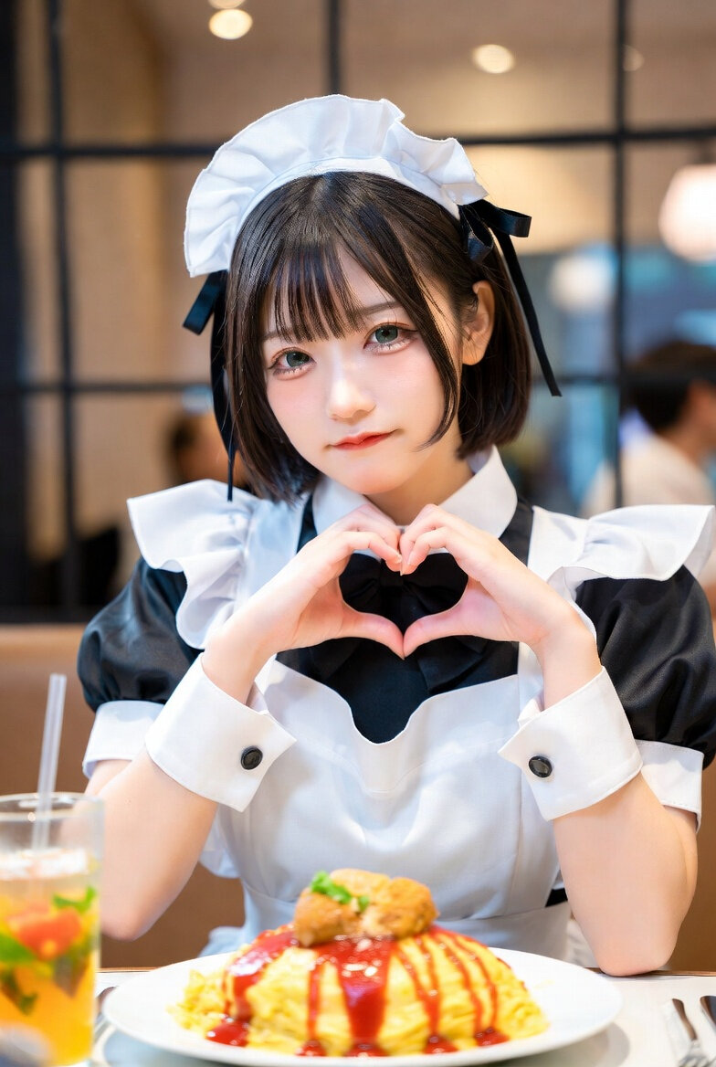 メイド喫茶のメイドである女性のリアルなフォト。装飾したオムライスと、カラフルなドリンクを前に、ハートハンドのポーズ。すこし涙ぐんでいる。