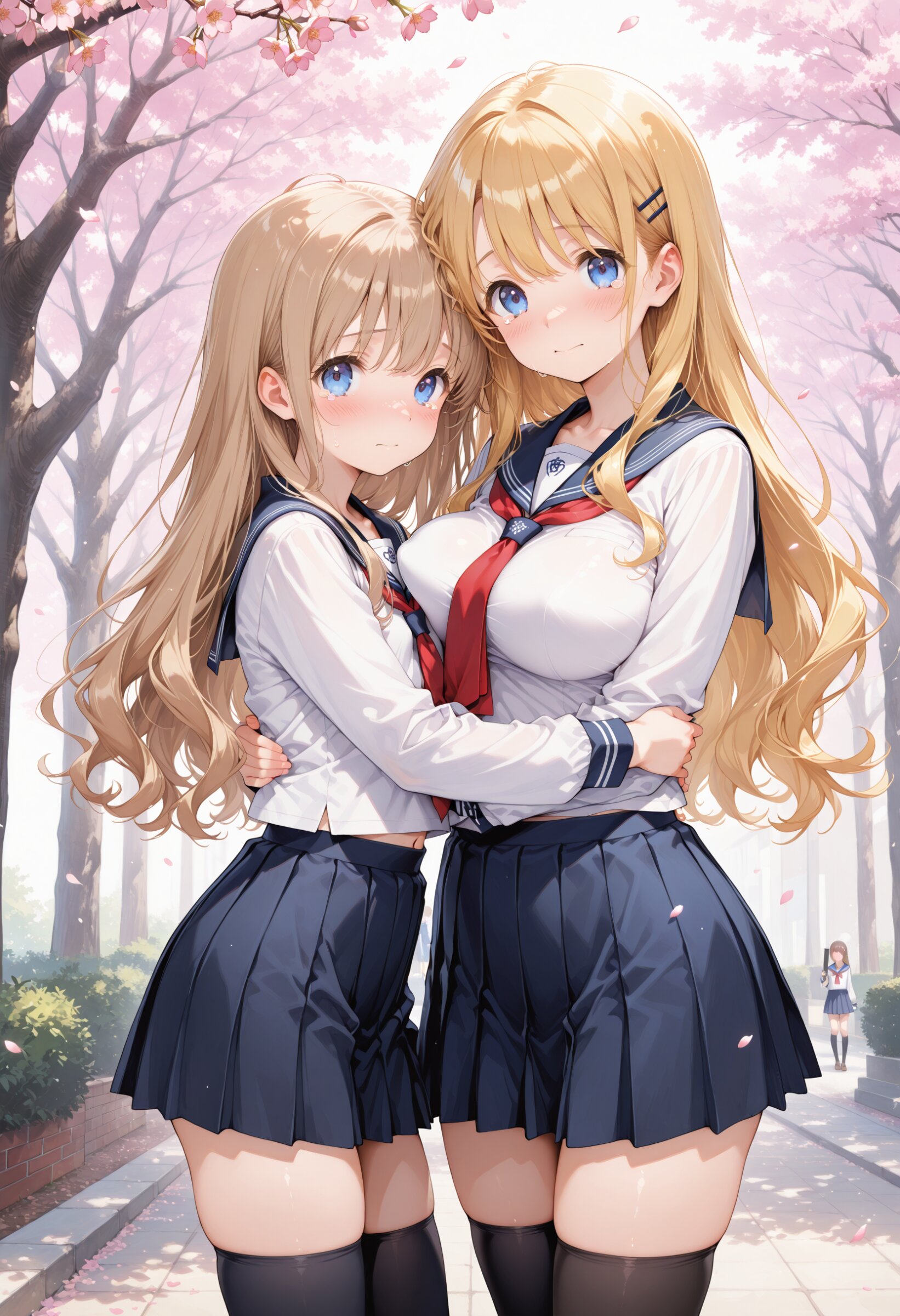 masterpiece, best quality, amazing quality, general, fine detail, official art, 2girls, loli, petite, high-school student, blonde wavy long hair, blue eyes, , (sailor collar), (white shirt), (red tie), (miniskirt), big breasts, impossible clothes, (perky breasts:1.2),Cherry blossoms, innocent expression, cowboy shot, , slim hip, black thighhighs, Graduation ceremony, graduation season, hug, Tears of farewell,