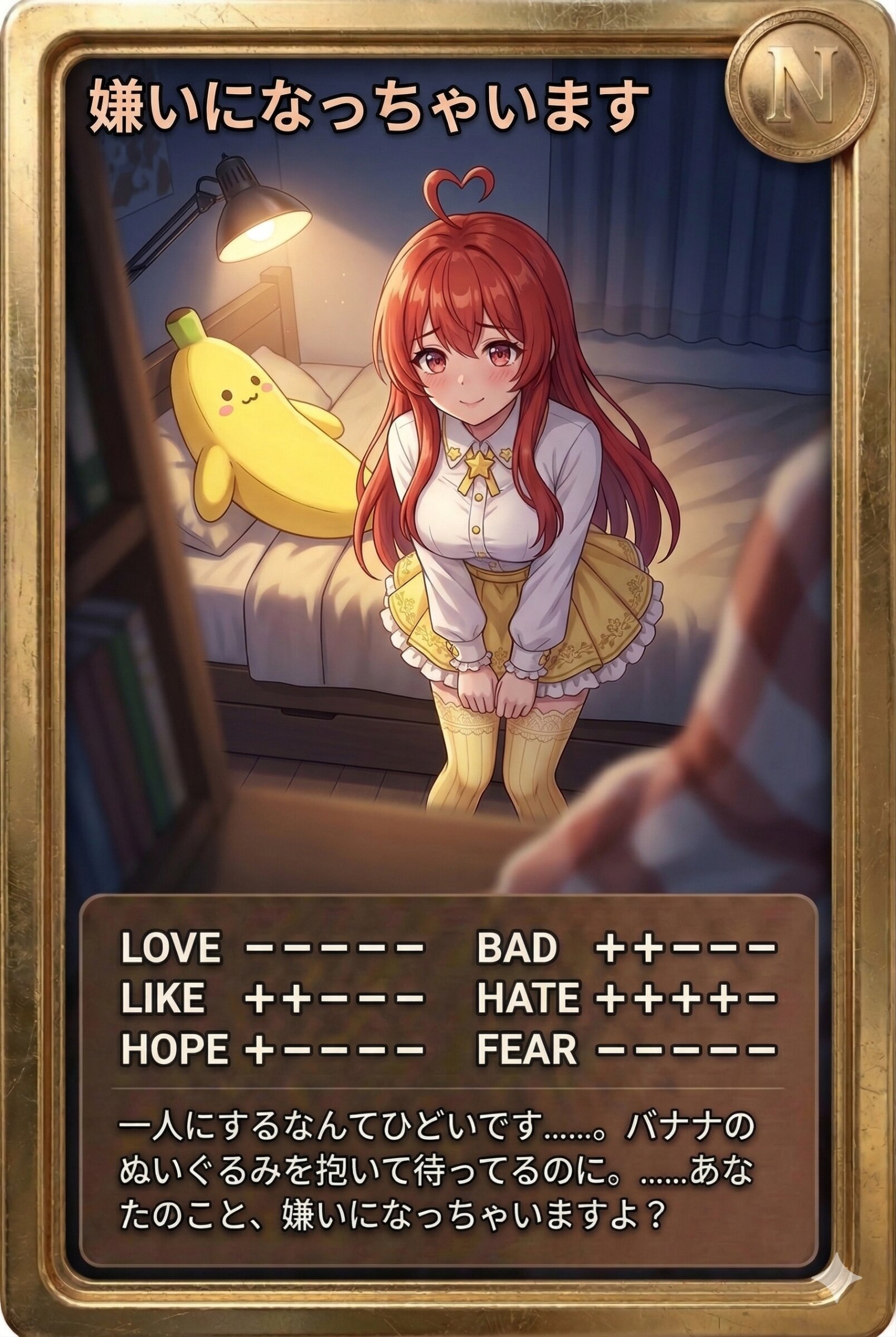 一人にするなんてひどいです……。バナナのぬいぐるみを抱いて待ってるのに。……あなたのこと、嫌いになっちゃいますよ?