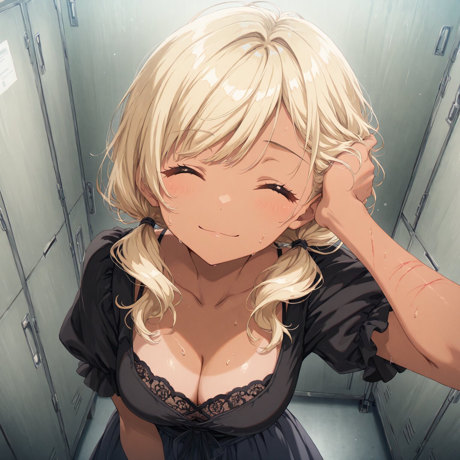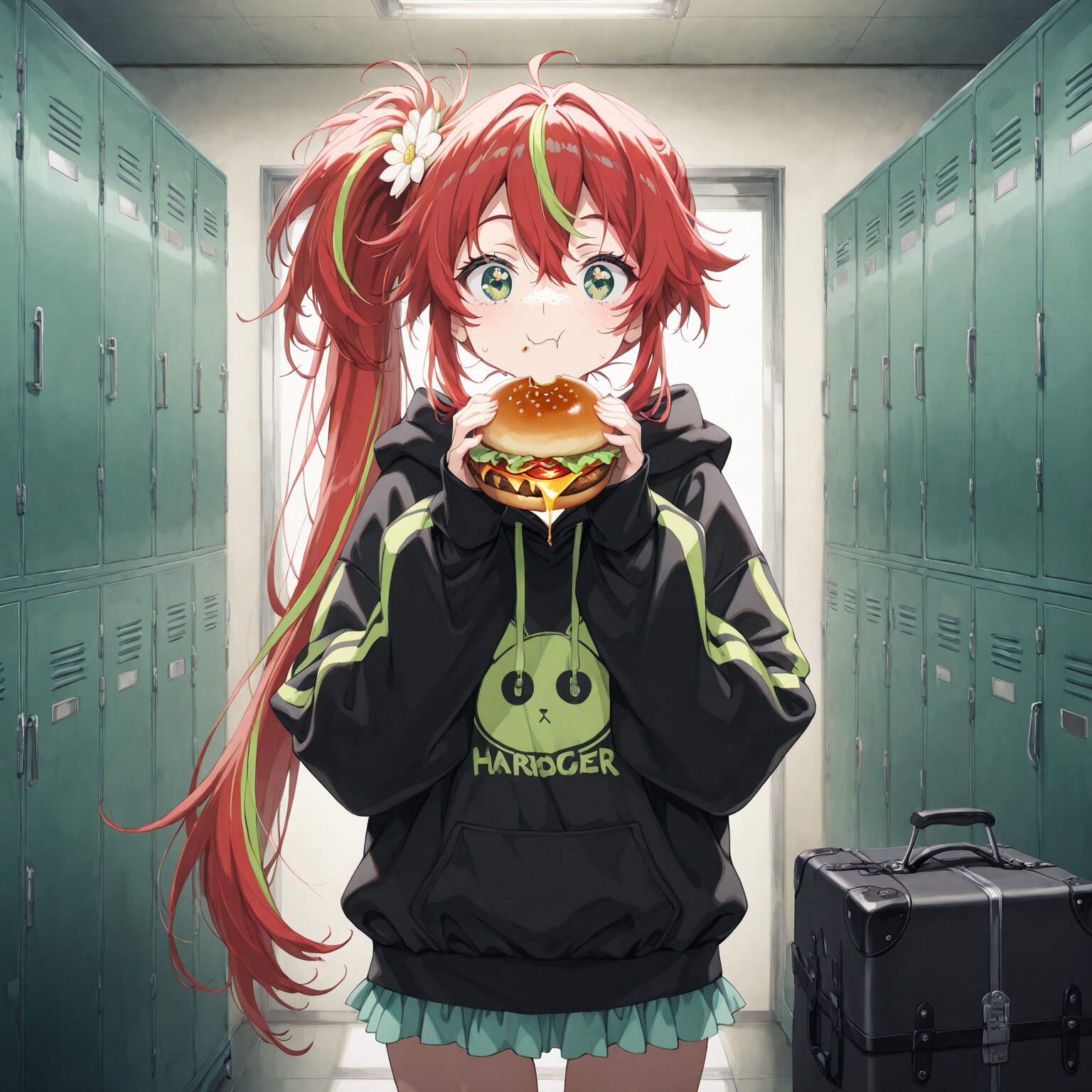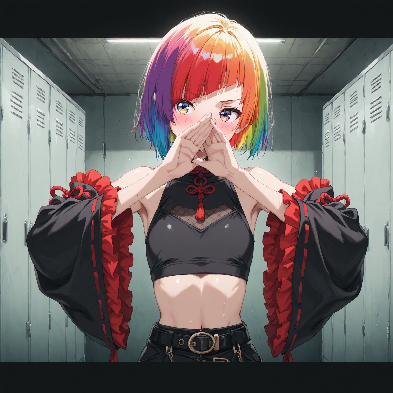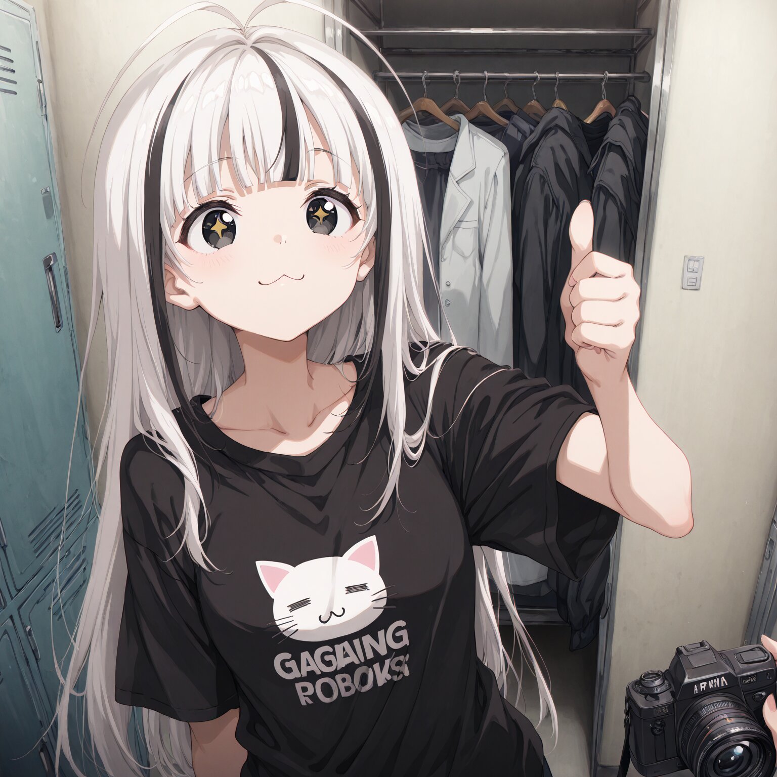(1girl), Medium long hair, straight hair, white hair, (black streaked hair:1.3), blunt bangs, antenna hair, (tareme), round eyes, star-shaped pupils, Black eyes cat mouth, :3 ((= =)) (Wearing a cap), black t-shirt Holding a camera, giving a thumbs-up Backstage, Dressing room, lockers, luggage area BREAK, (newest, anime, animation, anime screen capture, anime style:1.3) BREAK, (masterpiece, , vibrant, very aesthetic, highly detailed, best quality, 16k:1.3)