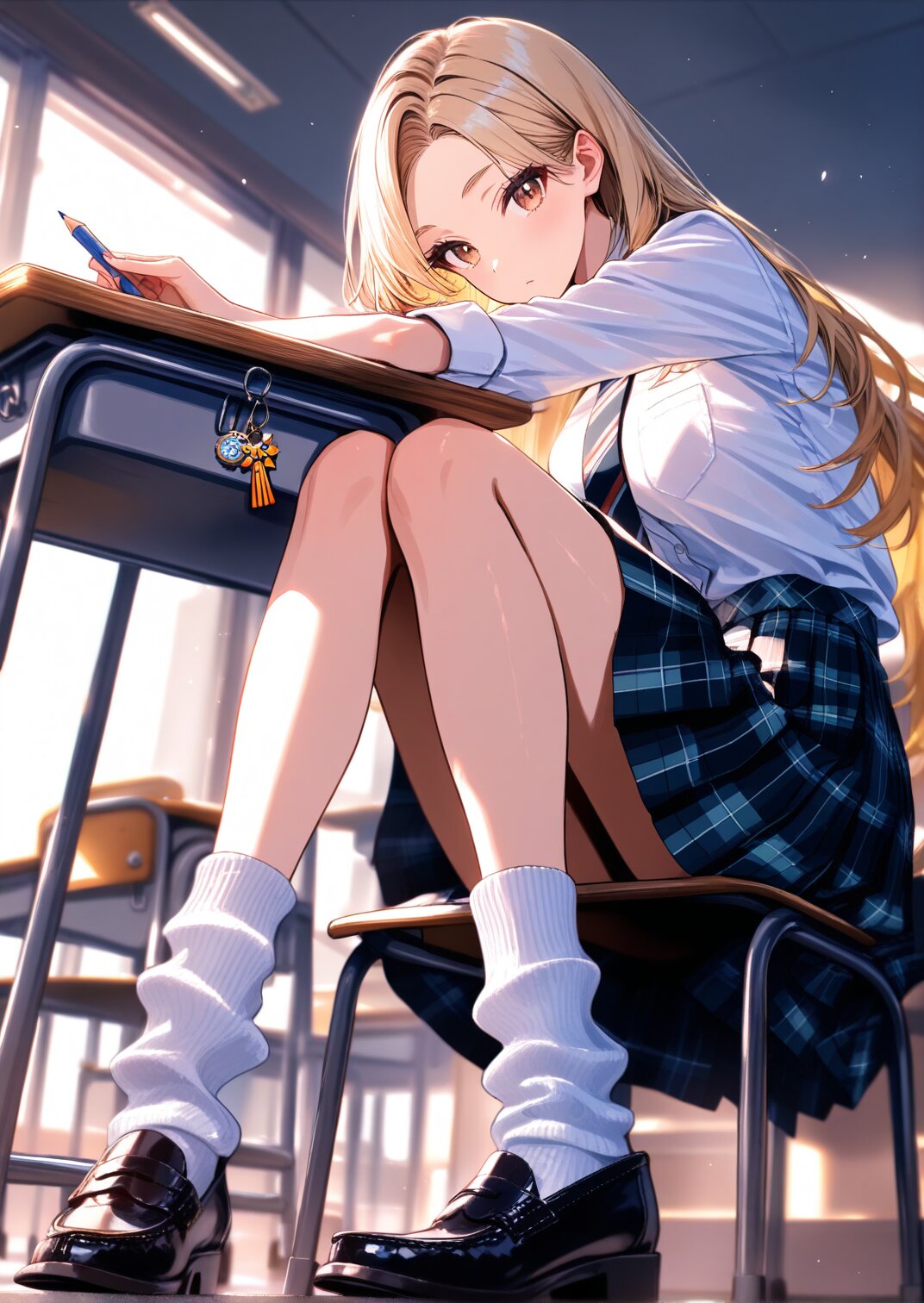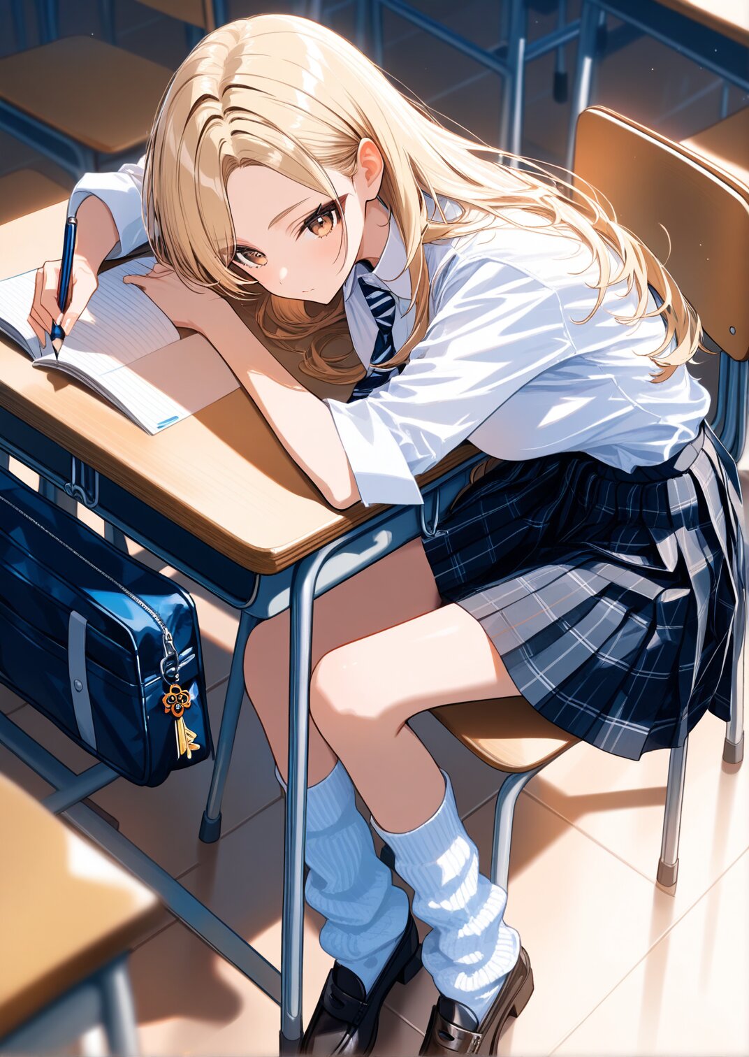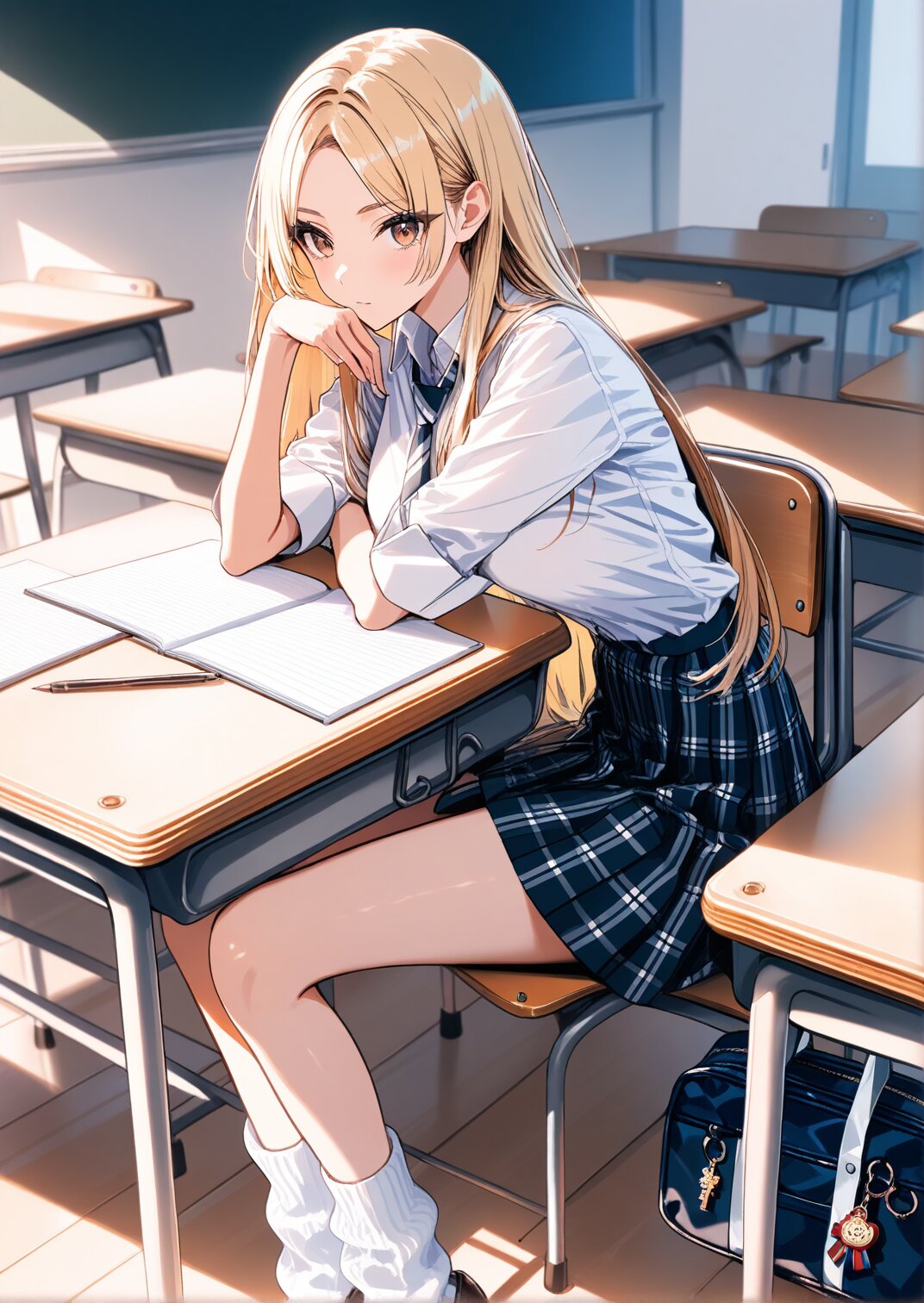 solo,1girls,masterpiece,best quality,super detail,high details,highres, blonde hair,thick bluish eyeshadow,thin eyebrows,thick black eyeliner,Highlighted eyes with eyeliner,false eyelashes, center parted long hair,parted bangs,honey blonde,face-framing highlights,sleek and silky,soft layered ends,glossy, brown eyes,adult,(big breasts:0.8),he's holding a pencil, white button-up shirt with rolled-up sleeves and loosely knotted burgundy striped tie,gray plaid pleated mini skirt (uniform style),white loose socks scrunched to calves,black leather loafers,navy school bag with flowers key charm, classroom,school_desk,during class,school chair,sitting in a chair and taking class, masterpiece,best quality,ultra detailed,highres,detailed glossy skin texture with shine,wide_shot,