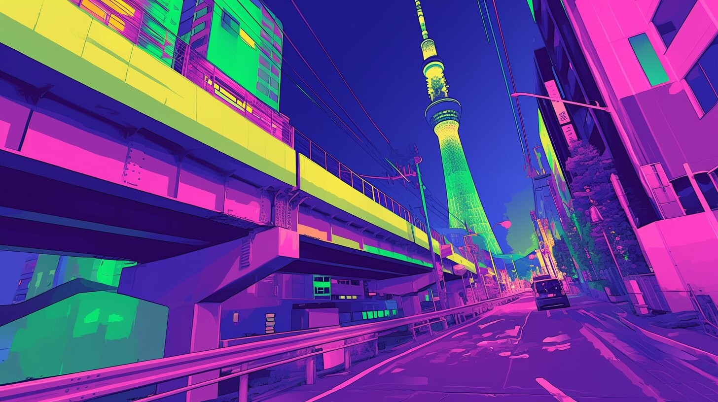 A nighttime street scene in an urban Japanese city, colored in neon. The style is vector pop art or synthwave-esque, with bright, contrasting colors such as pink, green, cyan, and yellow. btrax's branding style is inspired by this clean, strong design. The background is Tokyo sky tree,