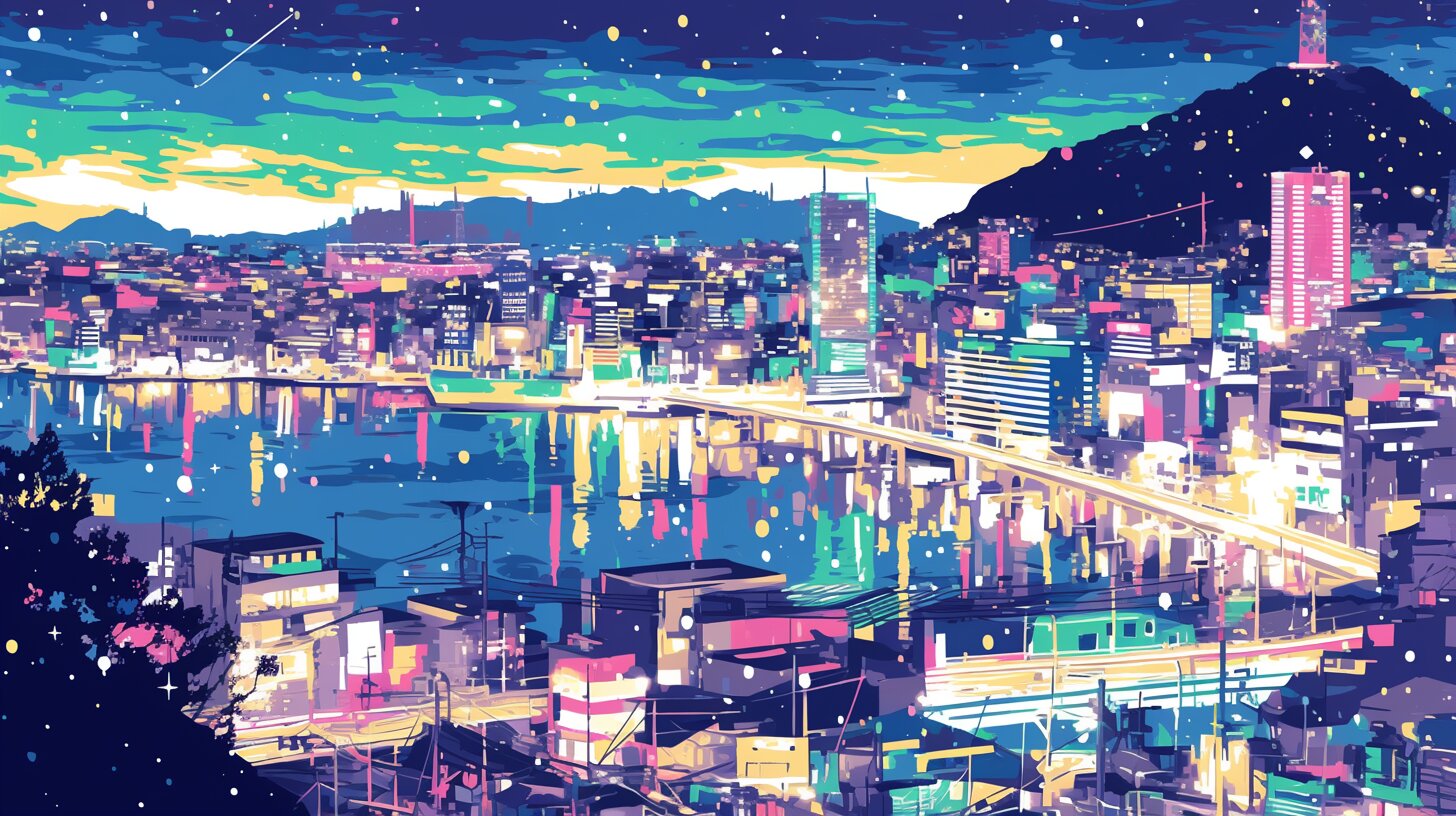 A nighttime street scene in an urban Japanese city Nagasaki, colored in neon. The style is vector pop art or synthwave-esque, with bright, contrasting colors such as pink, green, cyan, and yellow. btrax's branding style is inspired by this clean, strong design. The background is warship island,