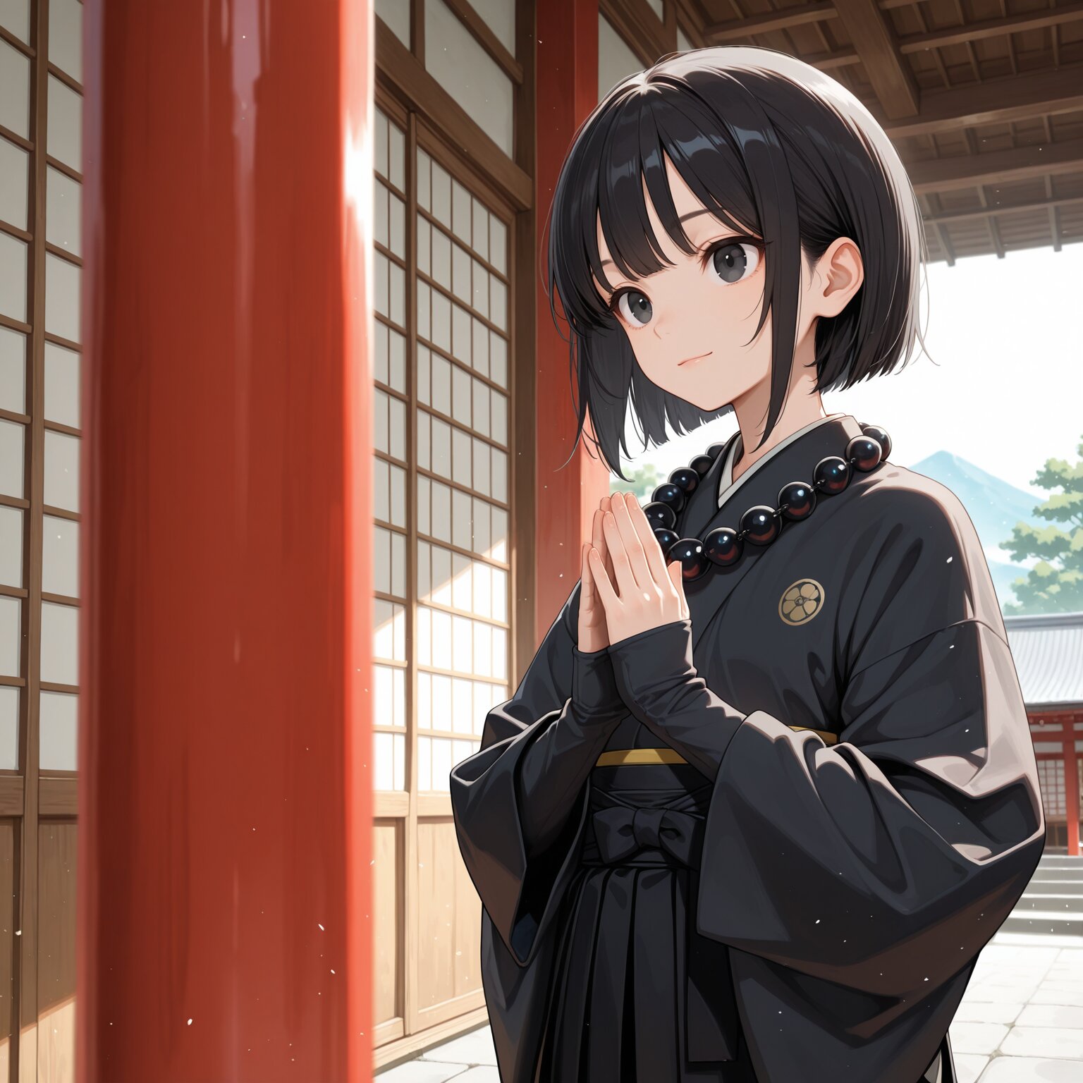 masterpiece,best quality,highres,ultra detailed,highly detailed,8k,general,1girl,solo,17yo,cute,(join palms together,long sleeves,black sleeves,wide sleeves,oversized sleeves,hides the wrists,black Buddhist prayer beads necklace:1.2),black hair,short hair,bangs,slender,small breasts,black eyes,light smile,closed mouth,japanese monk girl,(long kimono,black kimono,black sash,long black hakama),slender girl,cowboy shot,japanese temple, fantasy,