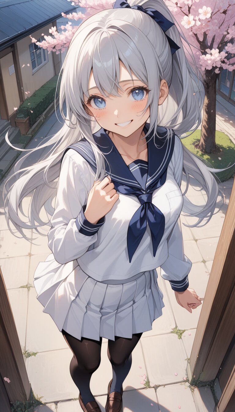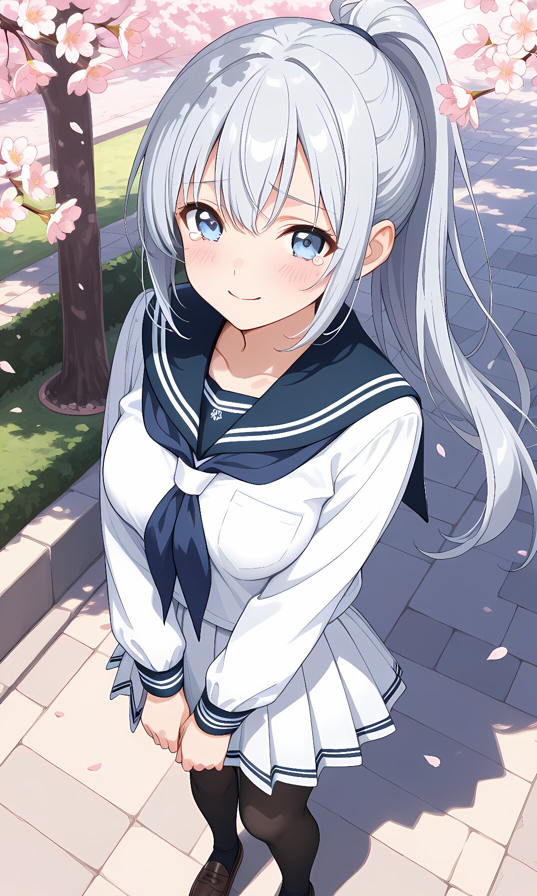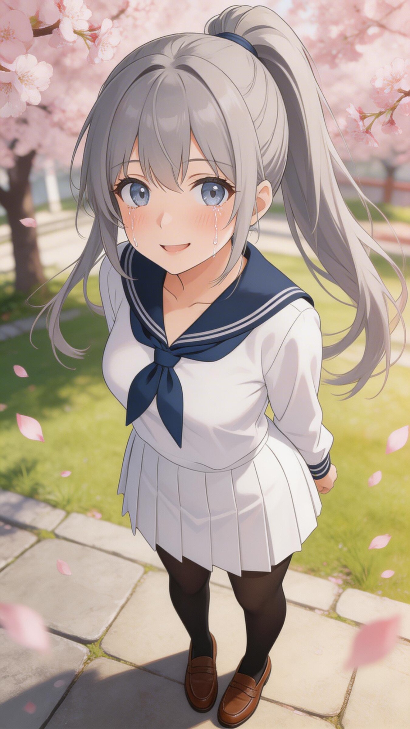 Best quality, Masterpieces, 1girl, Anime girl, gray blue eyes, long flowing silver gray hair in ponytail, blushing face, (medium breasts), school uniform, serafuku, long sleeves, white skirt, pleated skirt, dark blue sailor collar, dark blue neckerchief, sailor collar, white shirt, black pantyhose, black socks, brown loafers, detailed anime style, ((high school girl, 18yo)), smile, (tears), standing, looking at viewer, from above, (masterpiece), (best quality), (ultra-detailed), (illustration), beautiful detailed cherry blossoms, beautiful detailed courtyard
