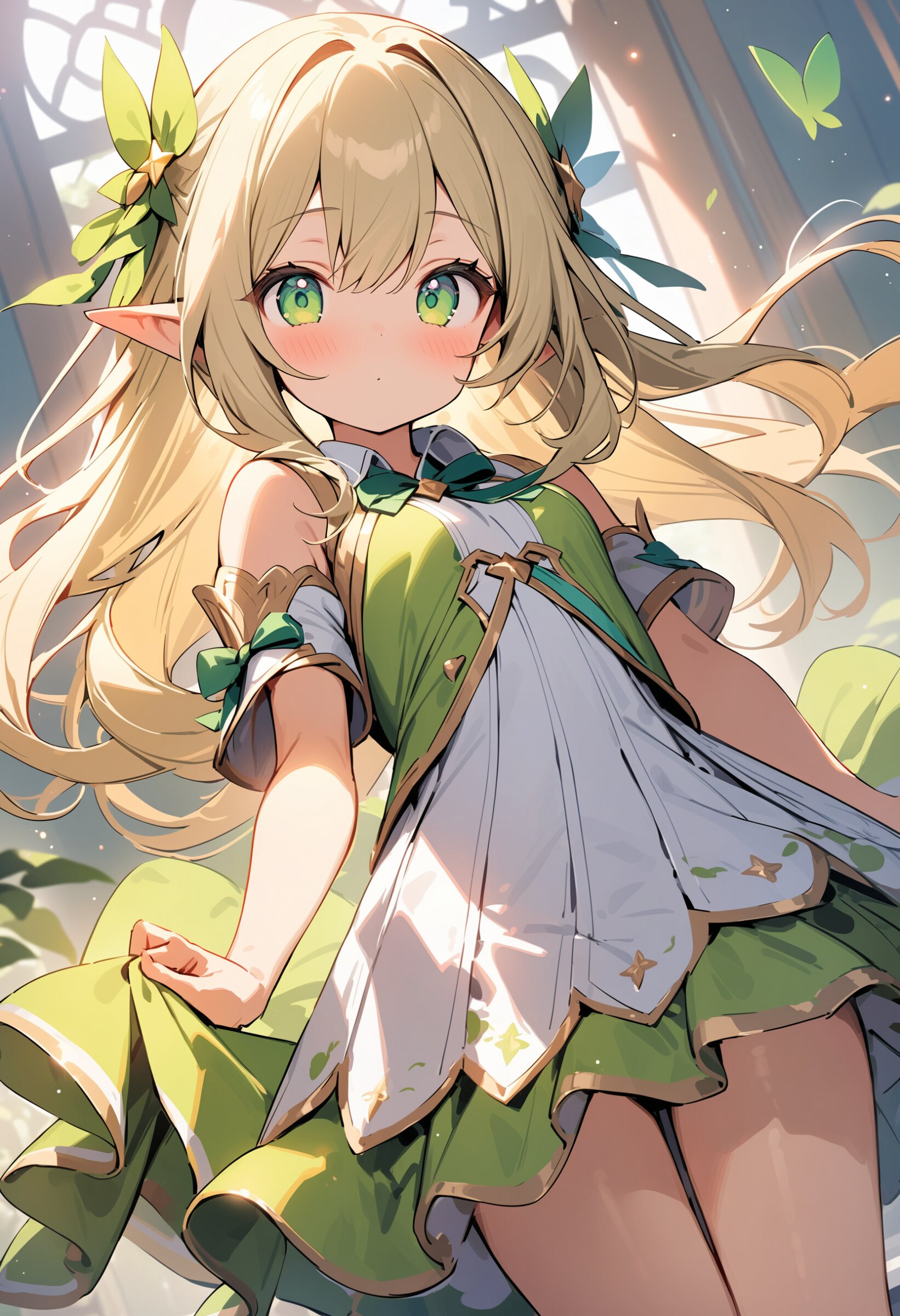((masterpiece)), ((best quality)), ((kawaii)), cute, (lovely), ((extremely detailed)), (beautiful), dynamic angle, a cute girl, 1girl, solo, ((elf)),beautiful blond hair, beautiful green eyes, ((beautiful eyes)), long hair, fantasy clothes,