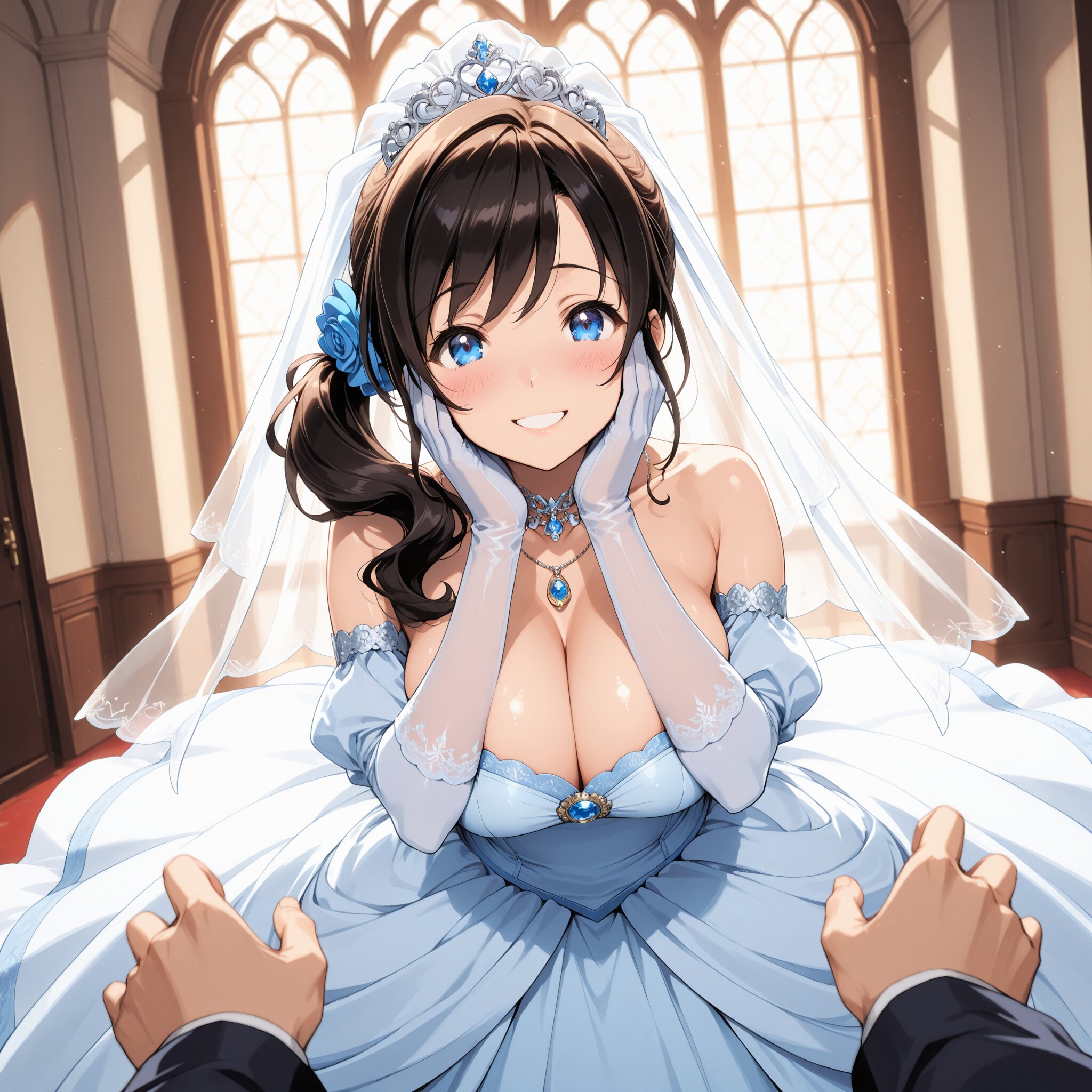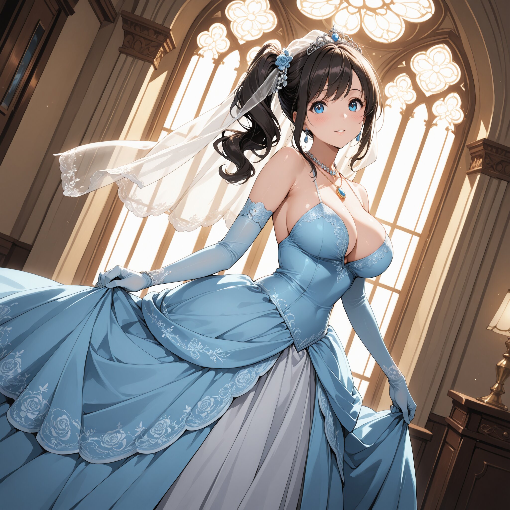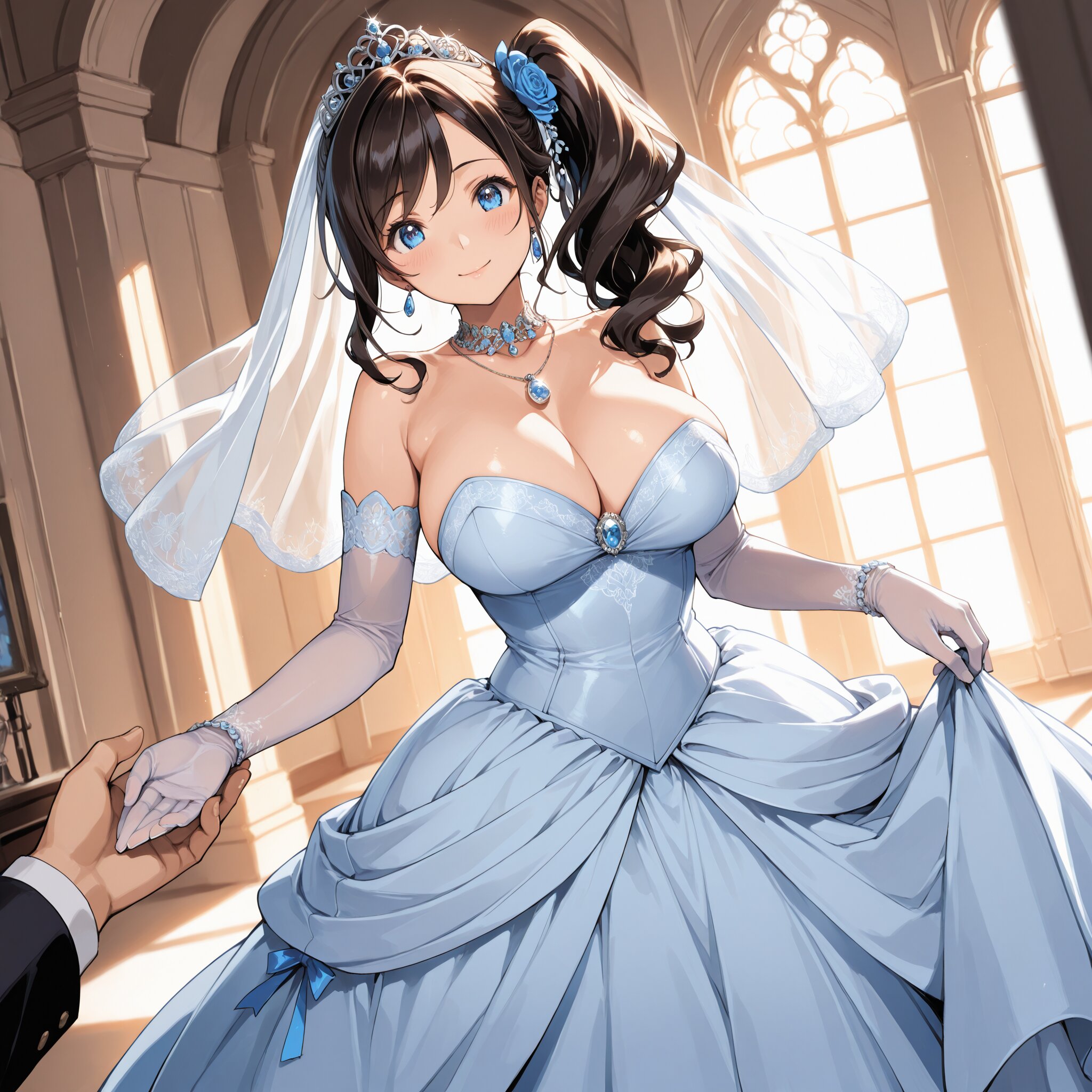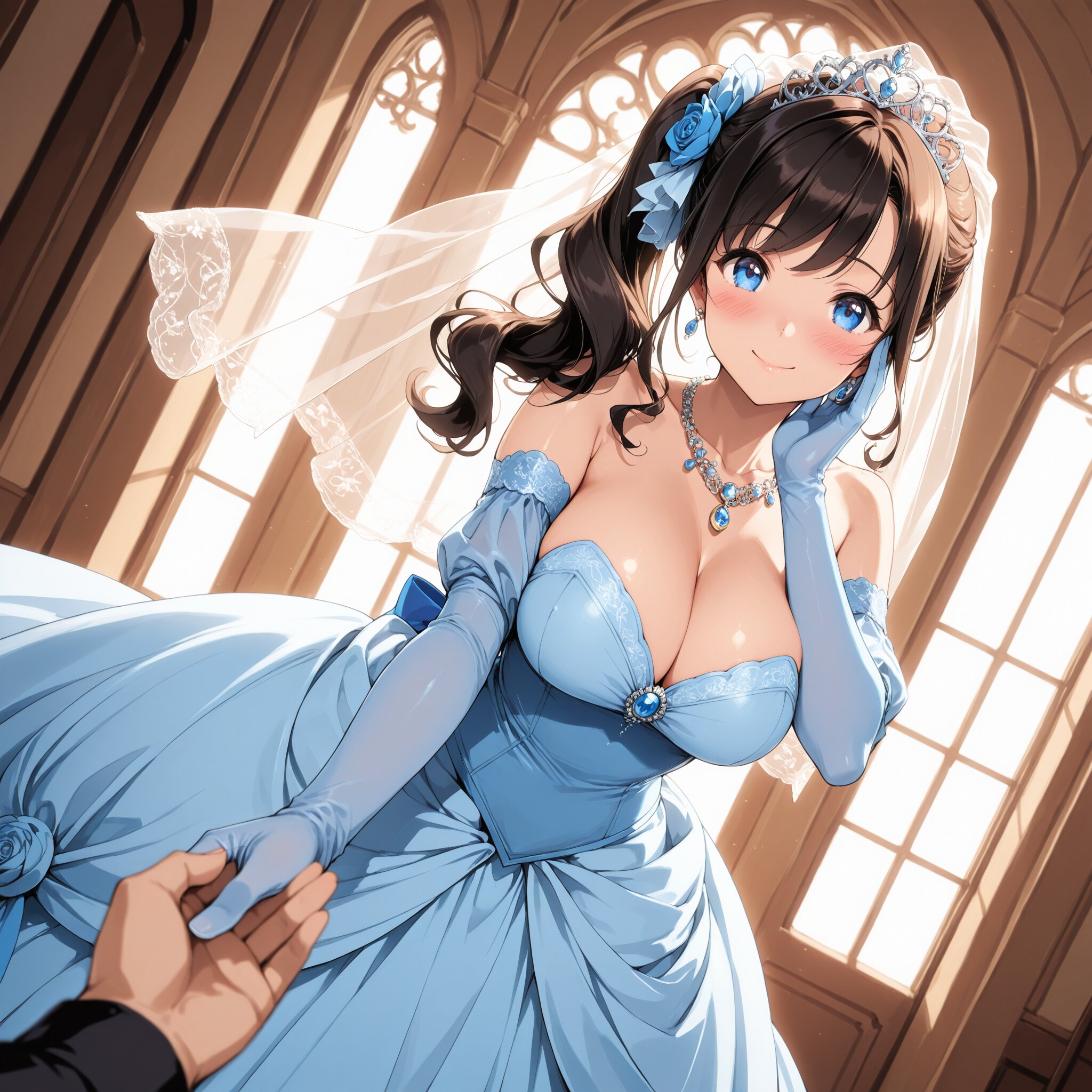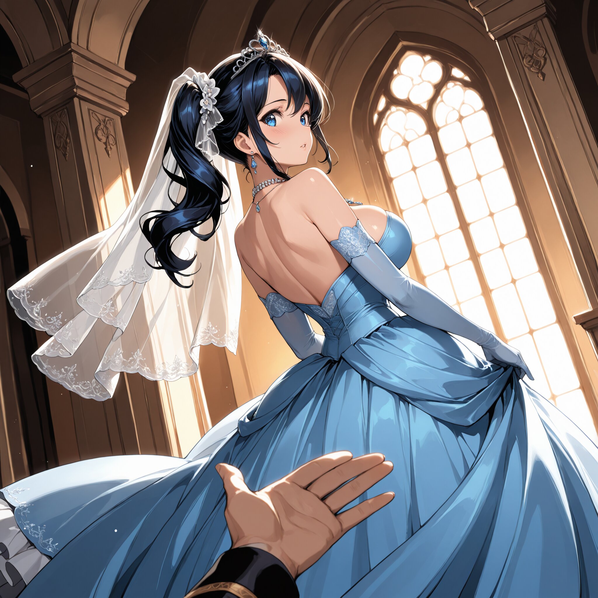 Masterpiece, top quality, superb quality, extremely beautiful, exquisite skin detail, captivating high resolution, exquisite detail, 8K, (beautiful large breasts), cinematic lighting, curves, focuses on the woman, ball gown princess dress, Renaissance style, wearing a wedding veil, Dutch angle, POV shot (his point of view), pose: walking away with her back turned, gaze: looking back, hairstyle: black, side ponytail, expression: hesitation and sadness, dress color: ice blue, accessories: sapphire tiara, heavy necklace, velvet gloves, foreground: his hand stops just out of reach, background: vast palace stretches into the distance, shallow depth of field, wind: veil sways precariously, light: high contrast, tension of parting