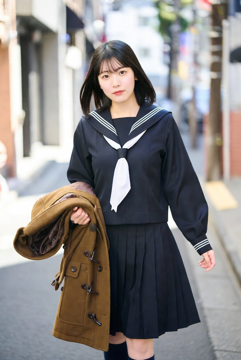 日本人女性18歳のリアルなフォト。濃紺のセーラーの制服を着ている。ブラウンのダッフルコートを手に持っている。日本の都心の歩道を歩いている。プロのカメラマンが撮影した仕上がり。自然光。