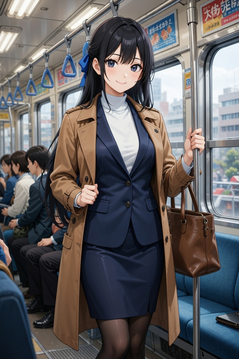日本人女性25歳が日本の電車で通勤しているデジタルイラスト。服装はビジネススーツ。ブラウンのコートを着ている。トートのカバンを持っている。
