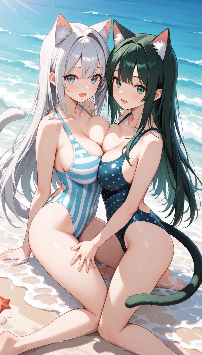 best quality,masterpiece,super detail,high details,highres,manga style,NSFW, two girls;, girl1: cat ears,(black long hair:1.1),deep green eyes,cat eyes,long hair,striped_swimsuit,((big breasts:0.8);), (girl2: cat ears:1.2),silver hair,hair intake,pale blue eyes,open one eye,cat eyes,long hair,polka_dot_swimsuit,(big breasts:0.8), kind_smile,:d,Slightly_open_mouth, full_shot,the tail of the cat,beach side,they're playing at the seaside,i'm on the water,