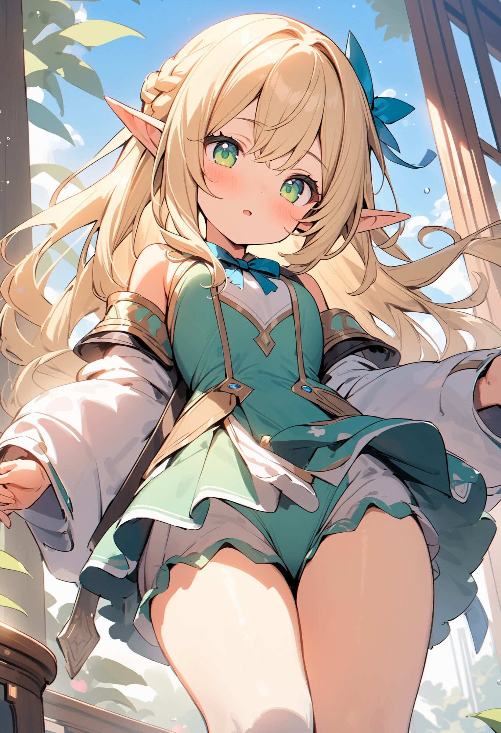 ((masterpiece)), ((best quality)), ((kawaii)), cute, (lovely), ((extremely detailed)), (beautiful), dynamic angle, a cute girl, 1girl, solo, ((elf)),beautiful blond hair, beautiful green eyes, ((beautiful eyes)), long hair, fantasy clothes,