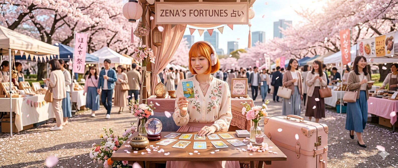 Wide cinematic composition, ultra-detailed, vibrant yet serene spring festival scene in a city park. Late March in a large modern city. Warm, gentle sunlight fills the air, while a light breeze still carries a faint coolness. The atmosphere is bright, fresh, and alive with the arrival of spring. The setting is a spacious urban park hosting a lively bazaar-style spring event. Numerous small stalls and booths line the pathways, selling handmade goods, food, and crafts. People stroll, chat, and browse, creating a soft, joyful crowd atmosphere. Above everything, Somei Yoshino cherry blossoms are in full bloom — delicate pale pink petals covering the trees and drifting gently through the air. Among the stalls is a small, elegant fortune-telling booth run by Zena. Zena sits behind a neatly arranged table, calm and composed amid the lively surroundings. She has orange bob hair and wears her signature stylish headphones, subtly integrated into her look as an idol. Her fashion blends cute charm and mature elegance with a spring theme: light fabrics, soft pastel tones, flowing silhouettes, refined accessories — an outfit that feels both approachable and enchanting, suitable for a modern fortune teller. Beside her booth is a vintage pale pink suitcase, rounded, charming, slightly worn, with delicate metallic accents catching the sunlight. It adds personality and suggests travel, story, and identity. On her table are tarot cards neatly arranged, with one card subtly highlighted in her hand or placed forward, suggesting an active reading moment. Her expression is gentle and perceptive, a soft smile that welcomes people, eyes calm and quietly insightful. Cherry blossom petals drift across the scene, some catching in her hair or resting lightly on the table. The breeze is soft — still slightly cool — yet unmistakably filled with the fragrance of spring. Lighting: warm natural sunlight, soft shadows, glowing highlights through cherry blossoms. Depth of field: Zena and her booth in focus, background crowd softly blurred. Color palette: pale pink, warm gold, soft greens, spring pastels. Atmosphere: lively yet peaceful, elegant, seasonal, emotionally warm. Ultra-detailed textures, realistic natural lighting, Japanese cinematic anime style or semi-realistic illustration, high resolution, spring festival atmosphere, themes of connection, seasonal joy, identity, and gentle human interaction.