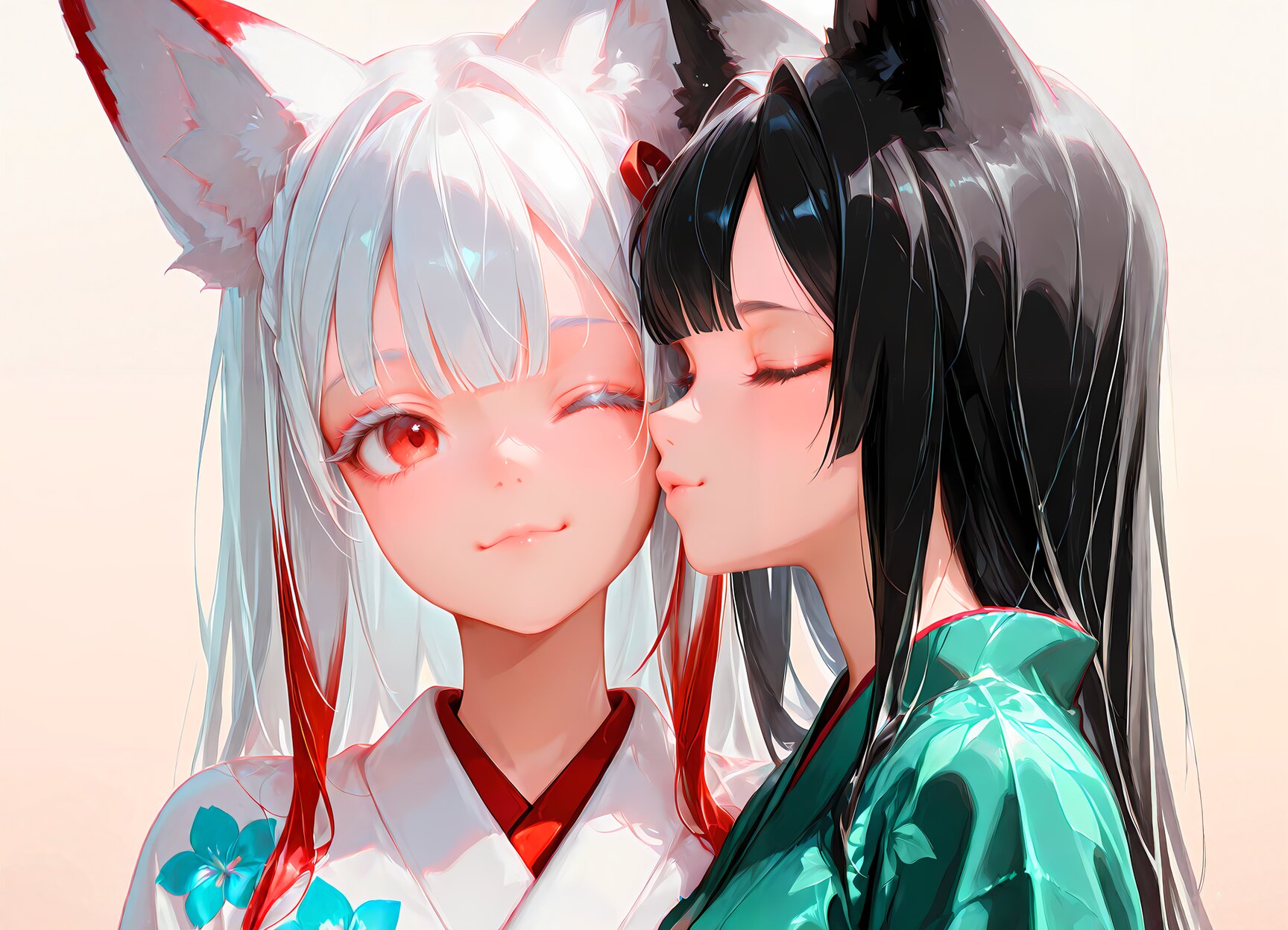 general,simple background,dreamy background,gradient background, appropriate posture,appropriate configuration,ideal ratio body proportions,perfect anatomy,<lora:Fixhands_anime_bdsqlsz_V1:1>,masterpiece,best quality,newest,absurdres,highres,ultra high res,8K UHD,hyper-detailed, 2girls,portrait, <lora:erase_human_ear_v10_ill:1>, , , straight-on,1girl,looking at another,smile,one eye closed,blush, <lora:miduki_kamishiro:1>,miduki_kamishiro,white eyelashes,fox girl,white hair, kimono,blue floral print kimono,white kimono, , general,simple background,dreamy background,gradient background, appropriate posture,appropriate configuration,ideal ratio body proportions,perfect anatomy,<lora:Fixhands_anime_bdsqlsz_V1:1>,masterpiece,best quality,newest,absurdres,highres,ultra high res,8K UHD,hyper-detailed, 2girls,portrait, <lora:erase_human_ear_v10_ill:1>, , , from side,1girl,looking at another,kissing cheek,blush,closed eyes, <lora:renge_kamishiro:1>,renge kamishiro,fox girl,black hair, green kimono,yagasuri,