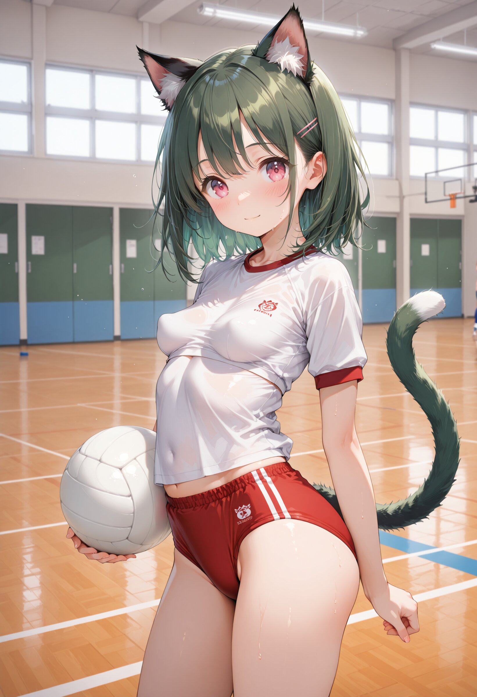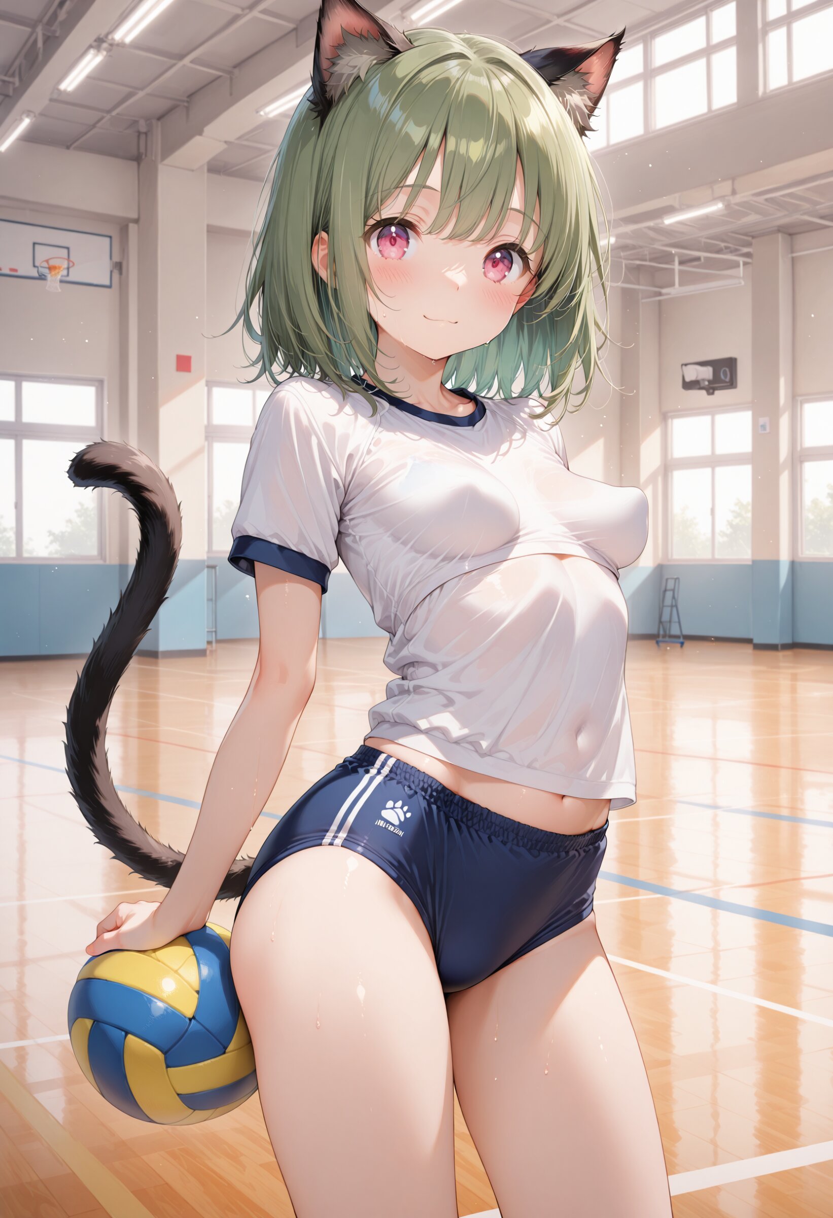 masterpiece, best quality, highres, ultra-detailed, extremely detailed, detailed, 1girl, loli, (petite:1.2), (school PE t-shirt:1.4), cat ears, cat tail, green hair, pink eyes, medium hair, buruma, (sports bra1.2), medium breasts, (perky breasts:1.2), school gym, innocent expression, look at viewer, playing volleyball , dynamic pose, happy,
