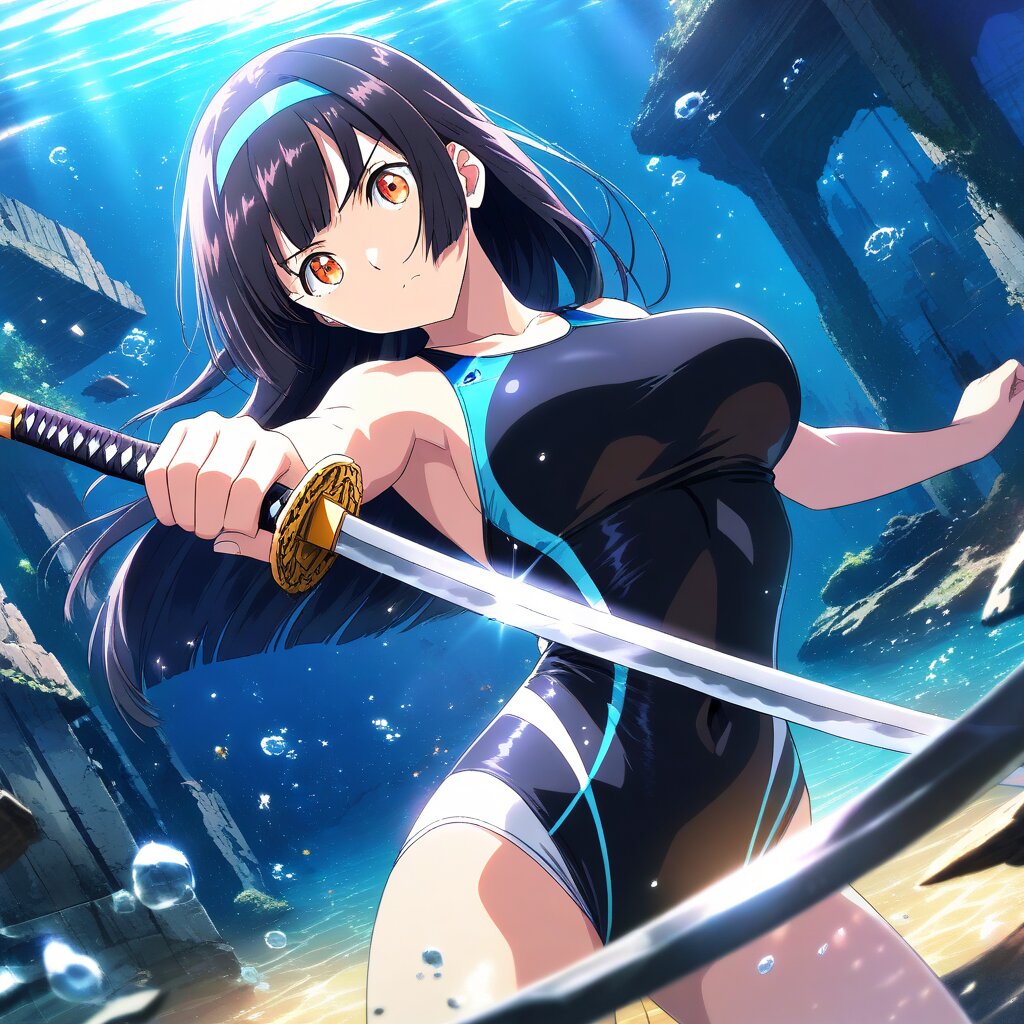 ((masterpiece)), ((best quality)), (ultra-detailed),anime style,cowboy shot, ruins,underwater, submerged, a cute girl,large bust, ((Black Racing-style swimsuit)), beautiful black hair, beautiful orange eyes, ((beautiful eyes)),straight hair, (blunt hair), ((blue hairband)), Holding a weapon in hand, gripping katana,dynamic pose,dynamic angle,Epic Battle Scene