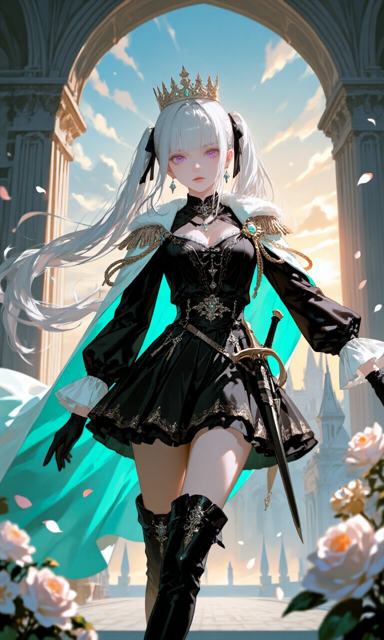 A stunningly beautiful 15-year-old girl with long, straight white hair styled in twintails with sidelocks and adorned with a delicate hair ribbon gazes directly at the viewer with mesmerizing purple eyes. Her delicate face features flawless, detailed skin and intricate jewelry including elegant earrings and a black choker. She wears an exquisite (Black luxurious Prince costume:1.6) with long sleeves, paired with a (luxurious light turquoise Cape:1.3) that billows dramatically. Her outfit includes a (luxurious Black mini skirt:1.4), (luxurious Black Boots:1.3), and (luxurious Black gloves:1.3), with a (dagger on waist:1.3) completing her princely ensemble. A (luxurious crown on head:1.4) adds regal elegance to her appearance. She stands in a dynamic pose outside a grand Palace with Gothic architecture, surrounded by romantic and classic academic elements. The scene is set at dawn with a hazy atmosphere, cloudy sky, and blooming flowers creating a dreamy, ethereal mood. The photorealistic 16K rendering showcases insanely detailed textures in her hair, skin, and clothing, making this a true masterpiece of best quality.