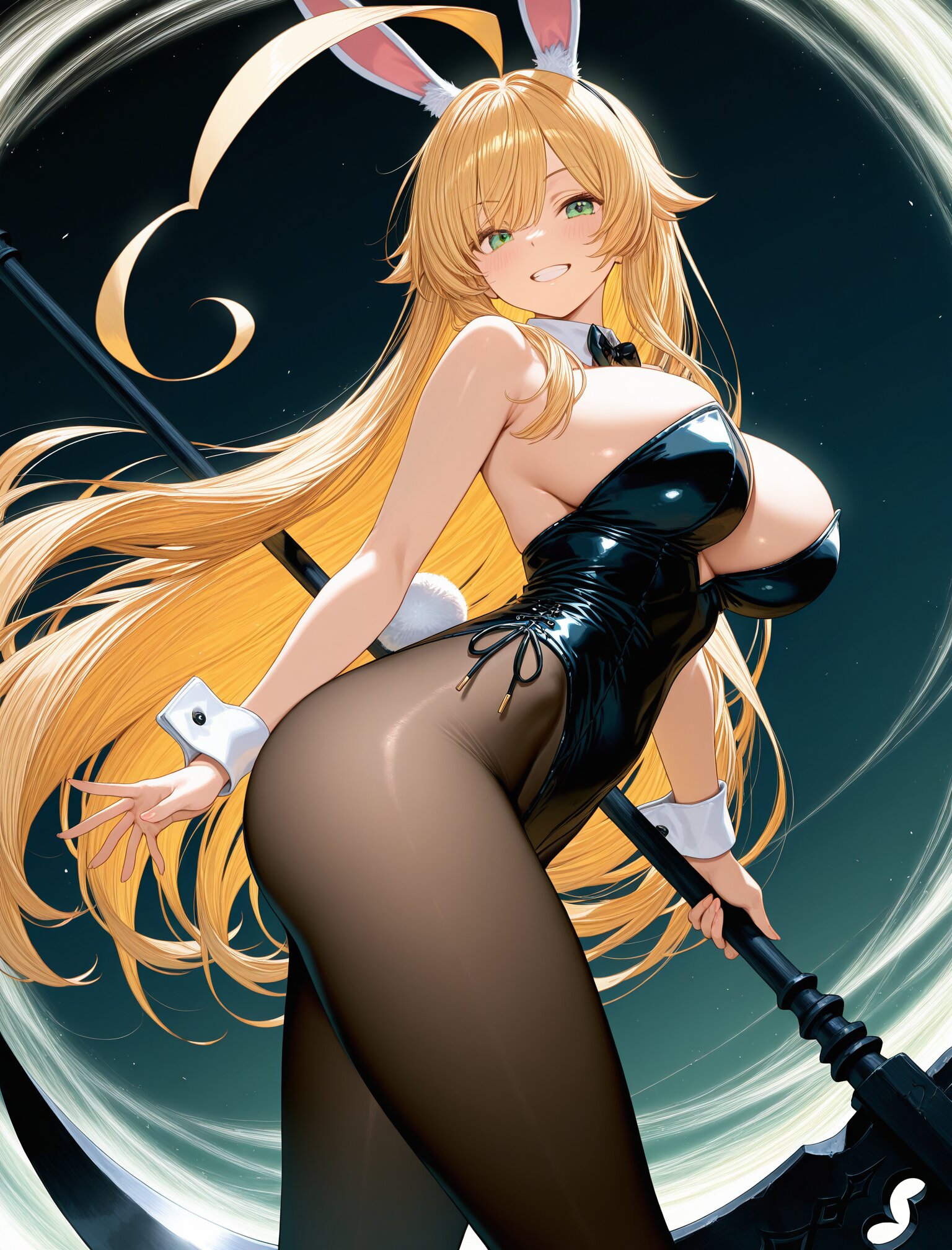(long blonde hair),(huge ahoge:1.5),(green eyes),(grin:1.3),(bunny ear:1.5),,(large breasts),(from side:),(bunny girl:1.3),(absurdly huge halberd:1.5), dynamic angle,masterpiece,best quality,very aesthetic, <lora:StS-Illustrious-Detail-Slider-v1.0:2.> <lora:sdxl-hairdetailer_02:2>