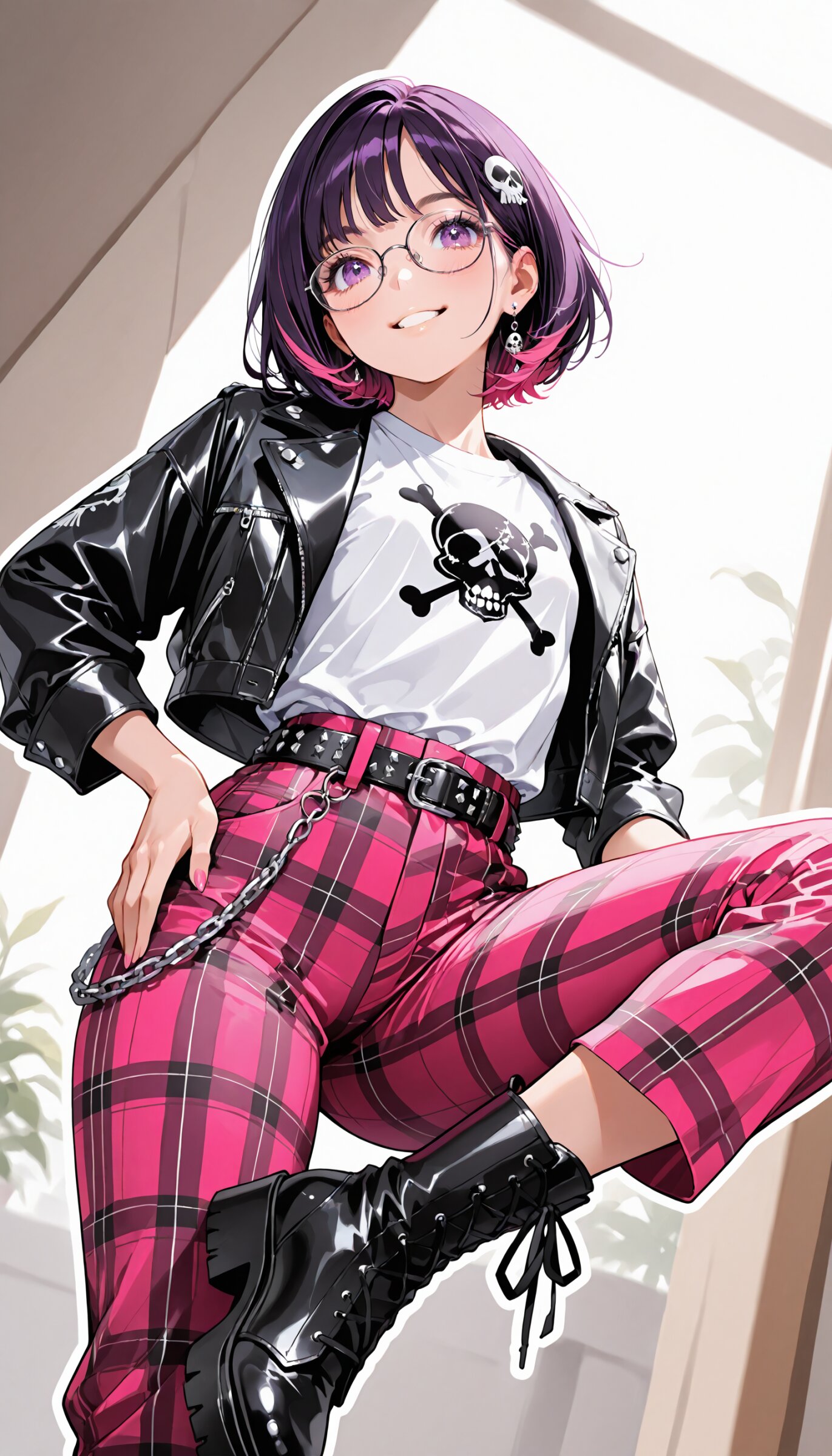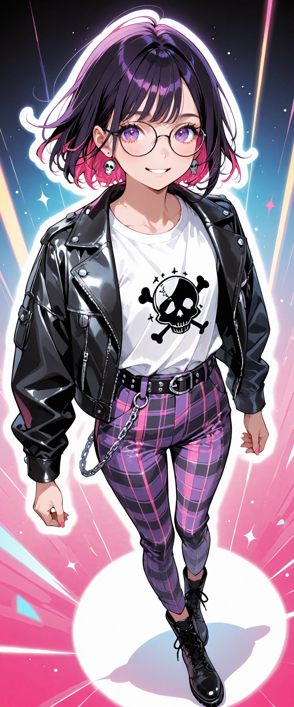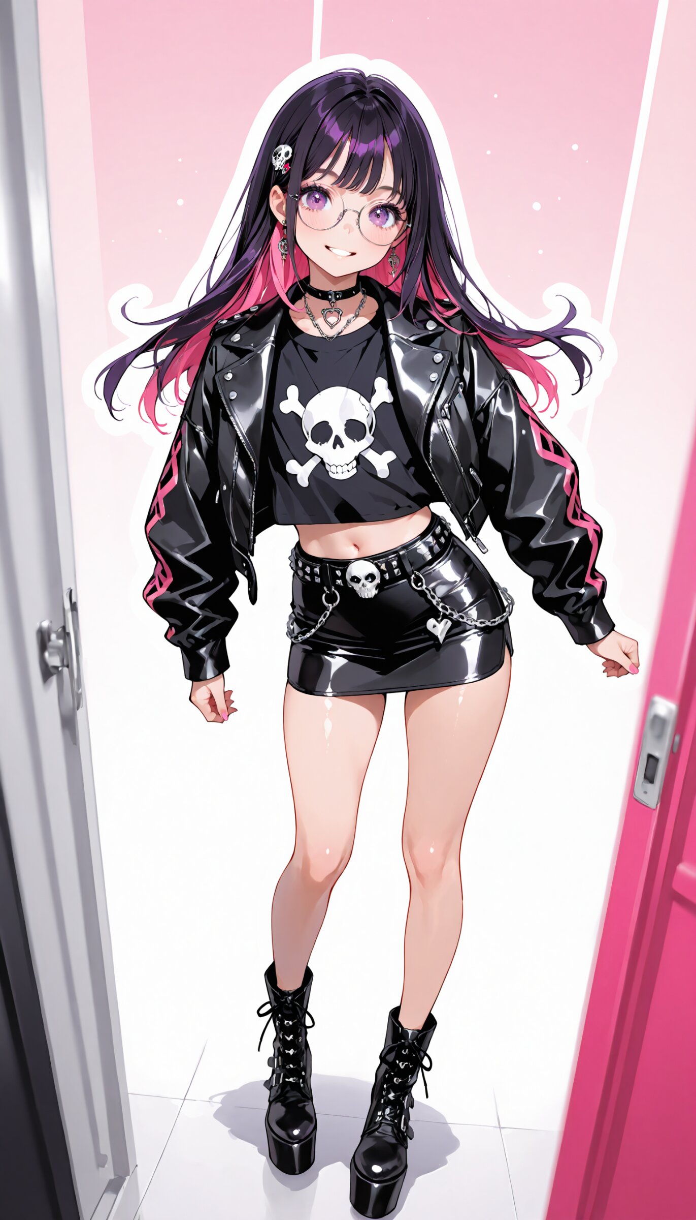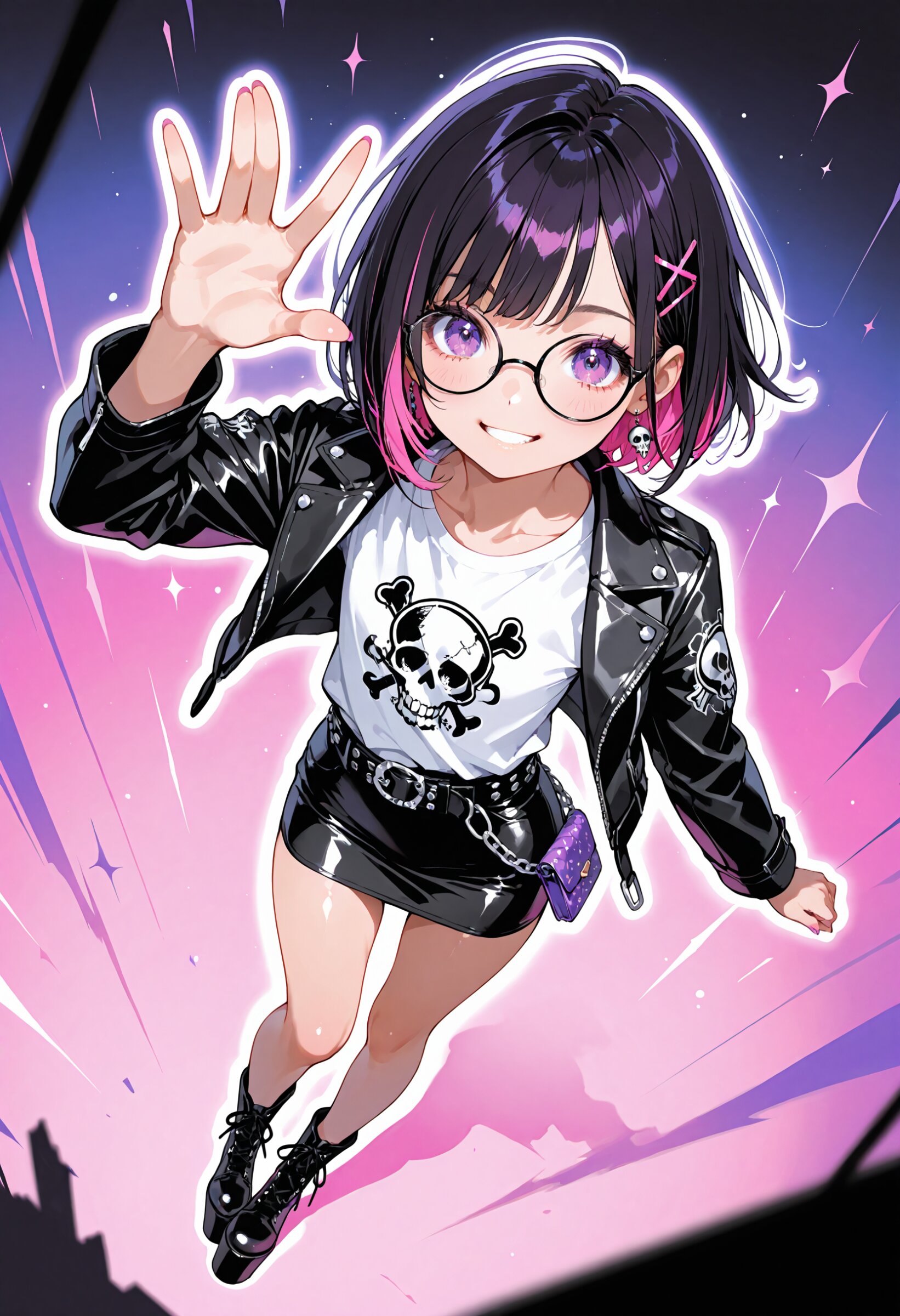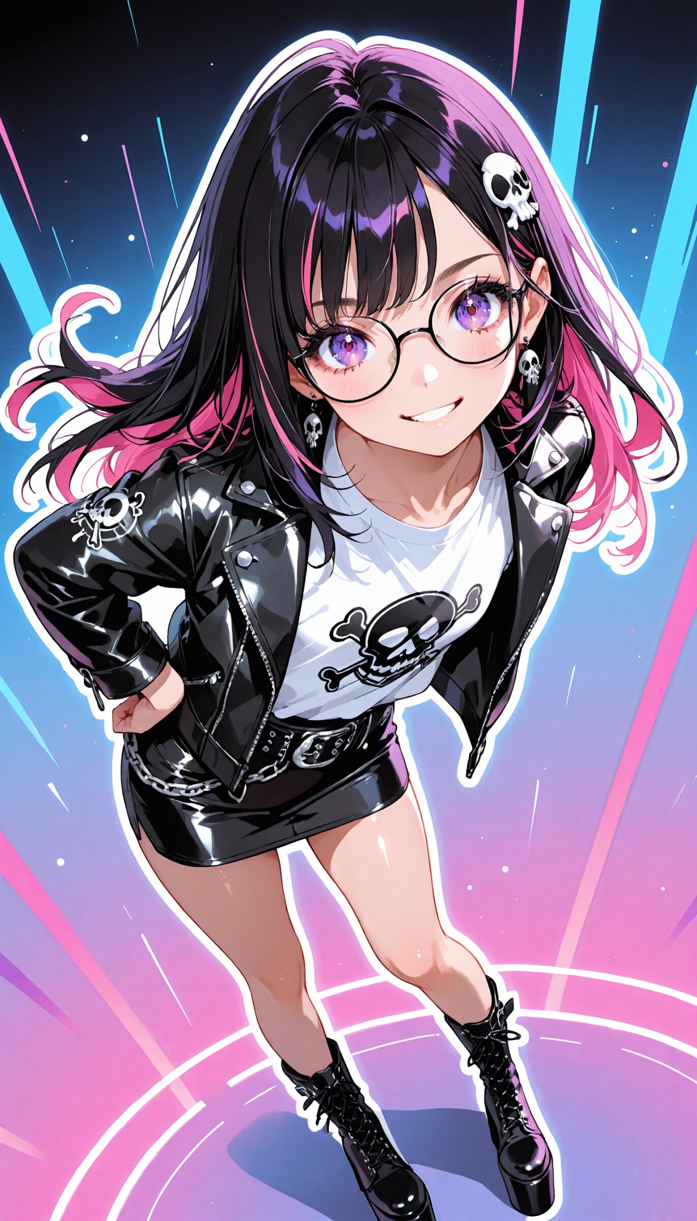 (rating: sensitive:1.2), score_9, score_8_up, score_7_up, score_6_up, (delicate illustration), (watercolor style illustration), (perspective, super dynamic angle from above), diagonal view. 1girl with glasses, Decora, black based outfit, neon pink and hot purple accents, wearing customized studded leather jacket, torn band t-shirt with safety pins, skull and crossbones accessories, mini skirt, chains, wallet chain on belt loop, platform boots, (fashion illustration, London punk rock style, ultra-intricate detailed), (white outline), bold colors, patterned fabric, beautiful composition, in the style of cute anime girl. BREAK insanely beautiful and detailed clothes, intricately shiny hair, beautiful small face, big round eyes, long eyelashes, double eyelids, parted lips, smile, kawaii, cute, flat chest, slender, {exquisitely delicate skin}, perfect anatomy, (dynamic angle, dynamic pose). BREAK perfect AI rendering, three-quarter view. ((DOF), blurry foreground), sharp focus on the girl, emphasizing depth, realistic background. BREAK (masterpiece, aesthetic quality, 8K, ultra-detailed), whimsical color palette, perfect design, amazing quality, high quality, absurdres, highres, cinematic lighting,