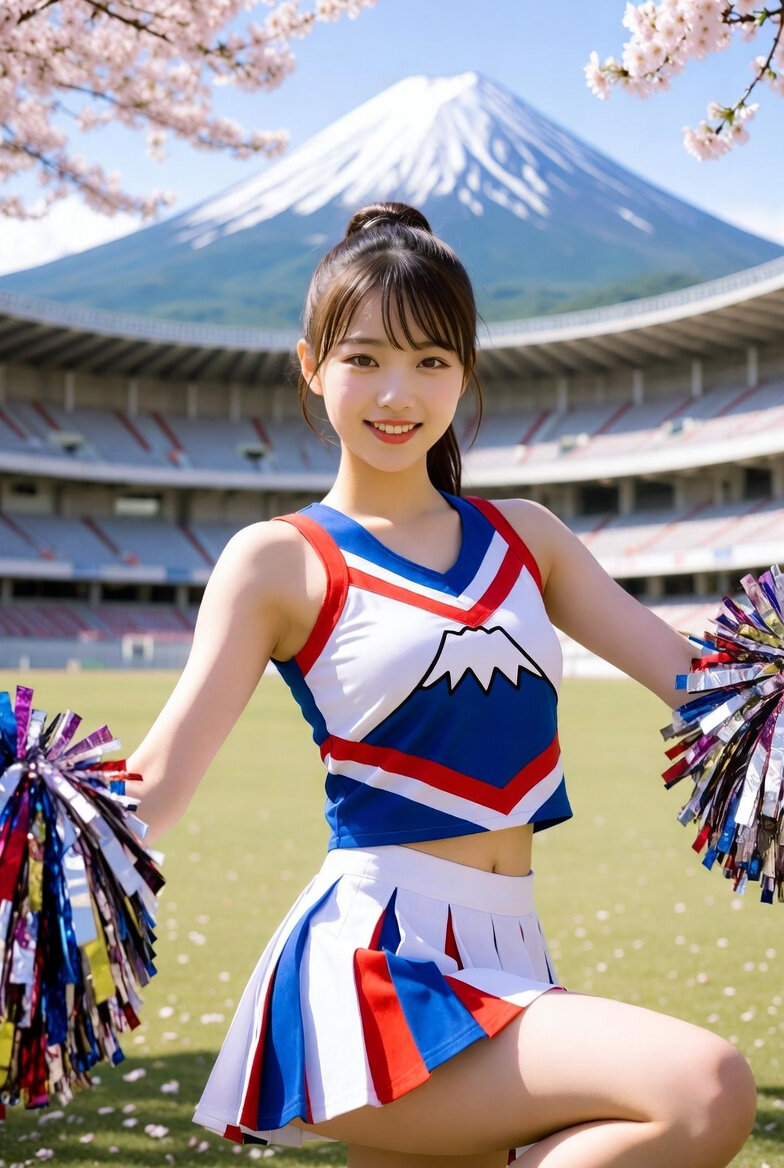 日本人女性18歳のチアリーダーのリアルなフォト。日本の富士山をモチーフにしたユニフォームを着ている。ポンポンを両手にもっている。背景は春のスタジアム。みんなを元気づけるポーズ。