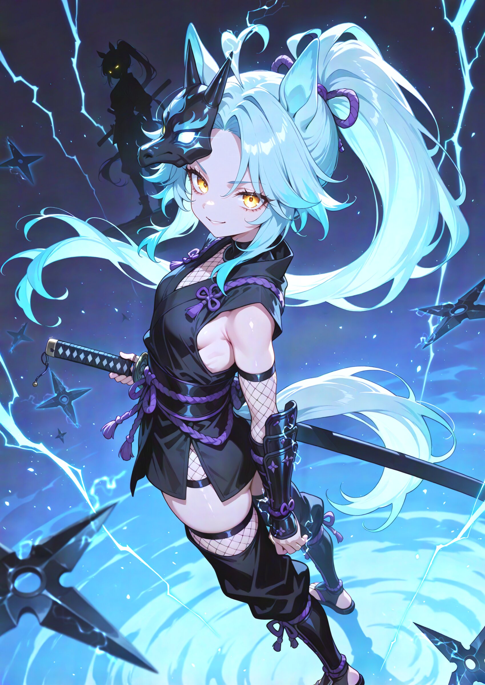 from side, looking at viewer, (portrait:1.0), (blurry foreground:1.0) (from above,looking up:1.0) , (dutch angle:1.2), weapon focus winter atmosphere, earthy color, glowing pastel colors light blue horse energy, pastel colors light blue silhouette of serious horse guardian, huge horse aura, 1girl, samurai, (muscular female:0.65), two-tone hair, violet and pale blue hair, prehensile hair, ponytail double-parted bangs heart ahoge fine hair, glowing eyes, eye trail, beautiful yellow eyes small breasts, ,, ninja cloth, short kimono, obijime, fishnet inner, fishnets, fishnet thighhighs, ninja pants,, kote, (ninjutsu:1.1), (wearing big shuriken:1.1) half mask, , sideboob, zouri, ninja pants, horse ears, horse tail, ,, japanese clothes, seductive smile, dynamic pose, kung fu attack, kung fu action, kuji-in, ninjutsu, floating weapon, tantou, raijin, lightning, thunderbolt, (swirling ink effects:1.2) fleeing, beautiful metallic luster, sharp katana, ultra detailed pastel colors light blue katana, silver particles, light trail, The background is a solid, bright pastel colors light blue, creating a striking contrast with the intricate, multi-colored design of the character, (standing silhouette:1.0), pop color background, (high saturation:1.2), drop shadow, ink-drenched shadows, solid black shadow blocks, abstract ink swath background, heavy chiaroscuro, high-contrast inky shading, negative space, grunge texture, calligraphic strokes, super fine concept art, 8K, graceful eyes, masterpiece, best quality, amazing quality, very aesthetic, absurdres, newest, professional art lots of details, , overexposure, sumie effect style, 4ur4_illu,shiny, glowing, glowing particles, glowing light particles, light particles, electric spark, <lora:noline (1):-0.5> <lora:sdxl2-flat2-512b:0.0> <lora:facelightup_xl_v10:0.5> <lora:V2_yakumo_alchemy:0.5> <lora:Aura_illu:0.1>
