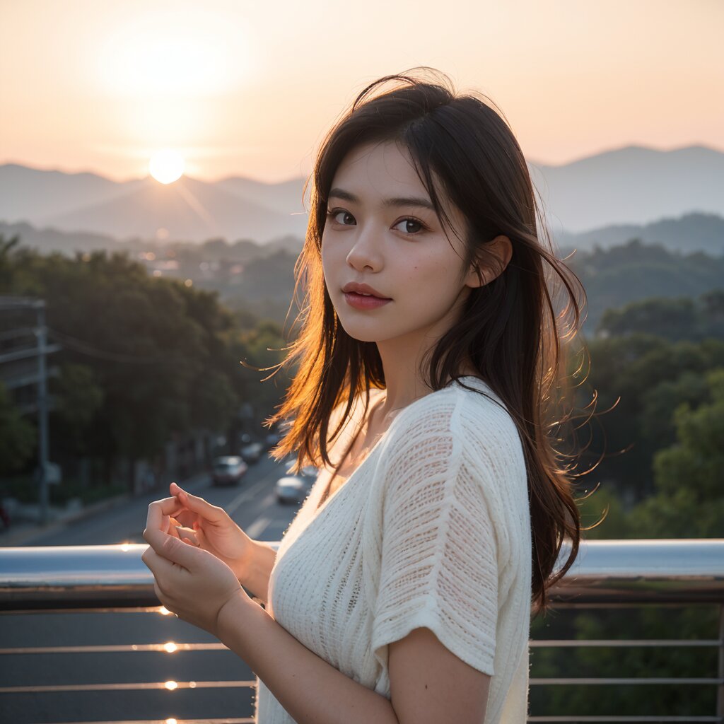 (masterpiece, best quality),(cowboy shot), ((Young face,: 1.9)), ((Gentle smile)), looking at viewer, short stature, photorealistic, natural skin texture, soft lighting, 85mm lens, shallow depth of field, A young beautiful woman standing on a scenic observation deck at sunset, wearing elegant summer clothing, smiling gently toward the viewer. She is the main focus of the image. Behind her stretches a breathtaking panoramic view of mountain ridges and forested valleys, bathed in warm golden-orange sunset light. The sky is colorful with soft clouds, and sunlight casts long shadows and highlights. High resolution, ultra-realistic, cinematic composition, fully detailed background, vibrant colors, sharp focus on both woman and scenery.