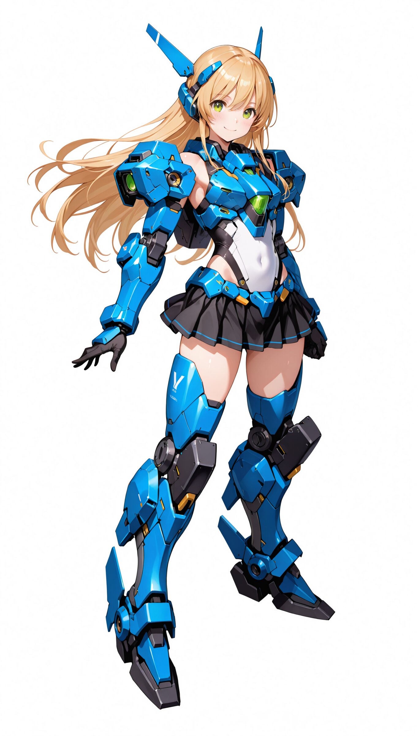 1girl, ((white background)), ultra detailed 8k cg render, masterpiece, high resolution, extremely detailed, mecha musume,mecha shoulder, mech leg, headgear, mecha armor, ((mini skirt)),long blonde hair, dropping green eyes, smile, dynamic posing,