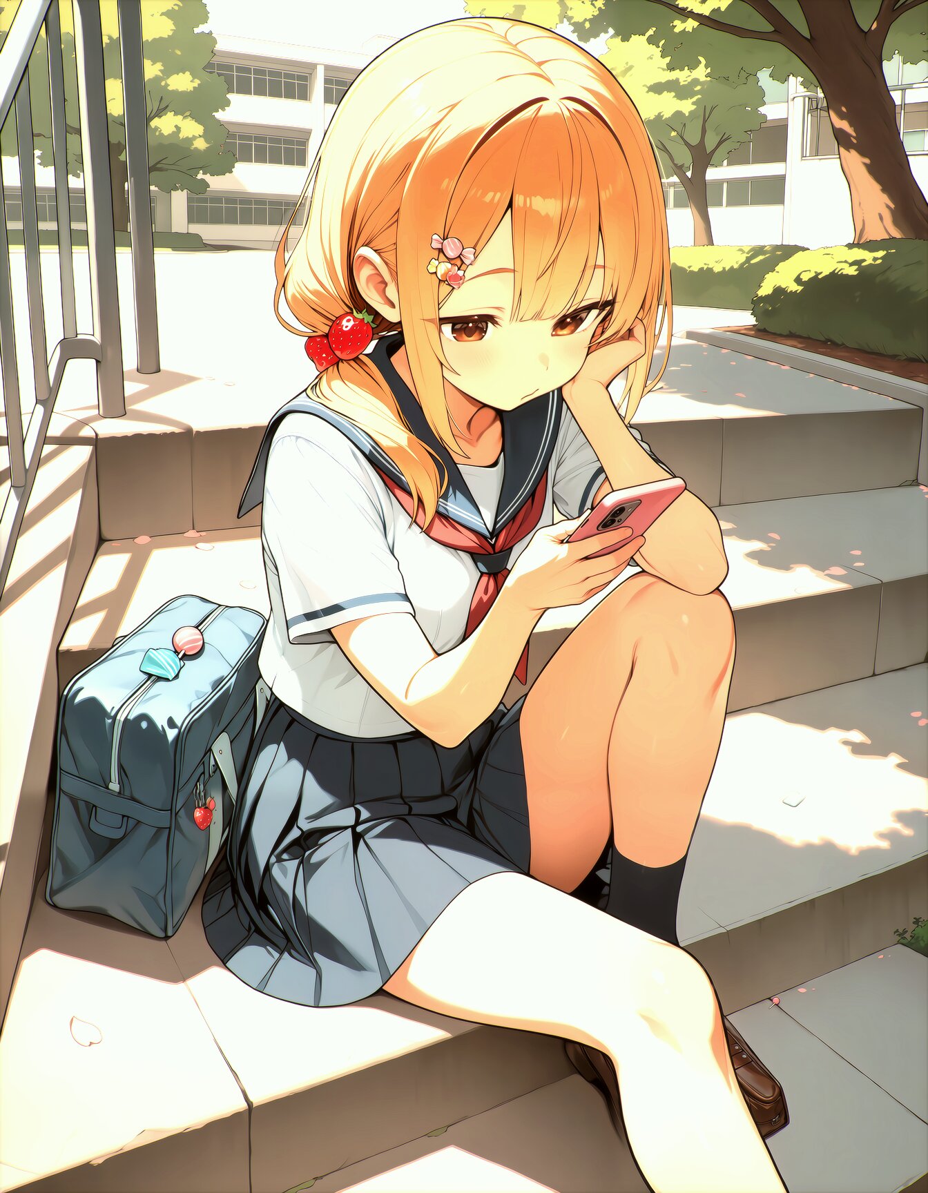 masterpiece, best quality, newest, safe, 1girl, solo, hinata, A girl with strawberry blonde side ponytail sitting casually on outdoor concrete school stairs, one leg stretched out and the other bent with her elbow resting on her knee. She is looking down at a smartphone in one hand with a relaxed half-smile, a lollipop stick poking out from the corner of her mouth. She wears a Japanese high school uniform with a navy sailor collar and pleated skirt, her school bag placed beside her on the step. Warm natural afternoon sunlight casting soft shadows of the stair railing across the steps. Green trees and school building visible in the soft bokeh background. A few scattered cherry blossom petals on the stairs. Gentle warm color palette, natural soft lighting, slice of life atmosphere, upper body to full body framing, slightly elevated angle looking down at her, relaxed everyday moment composition
