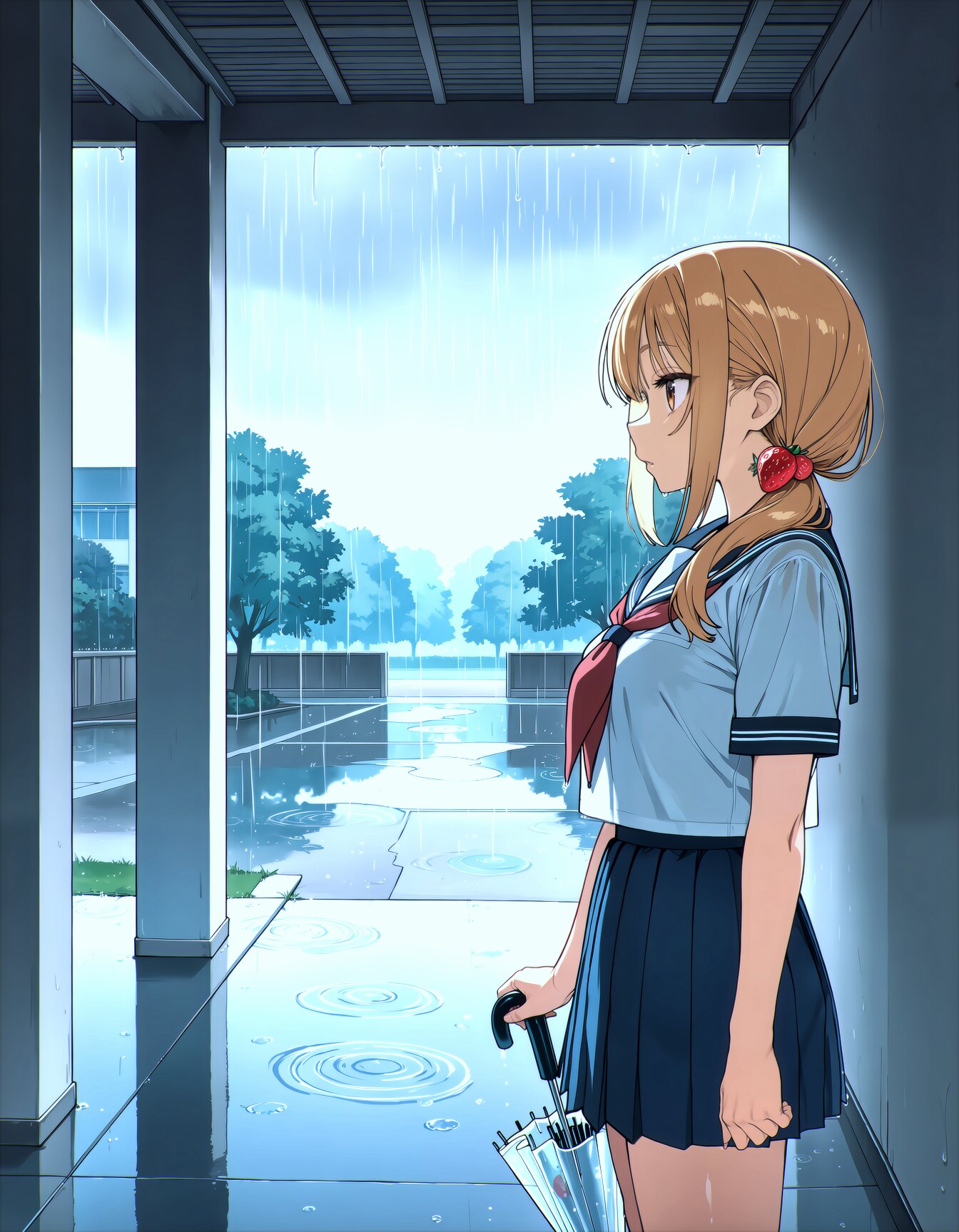 masterpiece, best quality, newest, safe, 1girl, solo, hinata, A girl with strawberry blonde side ponytail standing still in a covered school corridor walkway on a rainy day, gazing quietly at the rain falling in the open courtyard beside her. She wears a Japanese high school uniform with a navy sailor collar and pleated skirt, holding a closed clear umbrella loosely in one hand at her side. Her expression is calm and contemplative, a rare quiet moment with slightly parted lips. Rain falls steadily in the courtyard creating puddles with ripple reflections on the wet ground. The corridor has concrete pillars framing the scene. Cool diffused overcast light with subtle blue tones, wet surfaces reflecting the grey sky. A few rain droplets splash near the corridor edge catching light. Medium shot from slightly to the side, the corridor creating leading lines. Cool color palette, atmospheric depth, reflective wet surfaces, moody slice of life composition, rain bokeh in background
