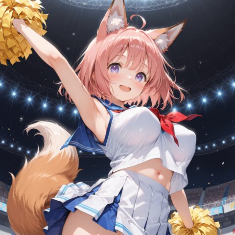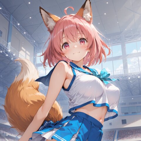 masterpiece, best quality, amazing quality, general, fine detail, official art, 1girl, loli, petite, beautiful hair, beautiful eyes, cheerleader, pink sailor collar, sleeveless, cleavage between sailor collar, midriff peek, beautiful legs, (big breasts:1.2), (perky breasts:1.4), school gym, innocent expression, smile, Practicing dance, dynamic action, Flexible chest that adapts to her movements, leaning forward,