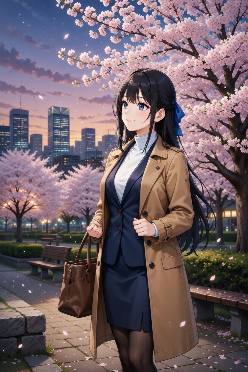 日本人女性25歳のイラスト。ビジネススーツを着ている。会社帰りの夕方に公園の満開の桜を見ている。背景は東京都心の公園。
