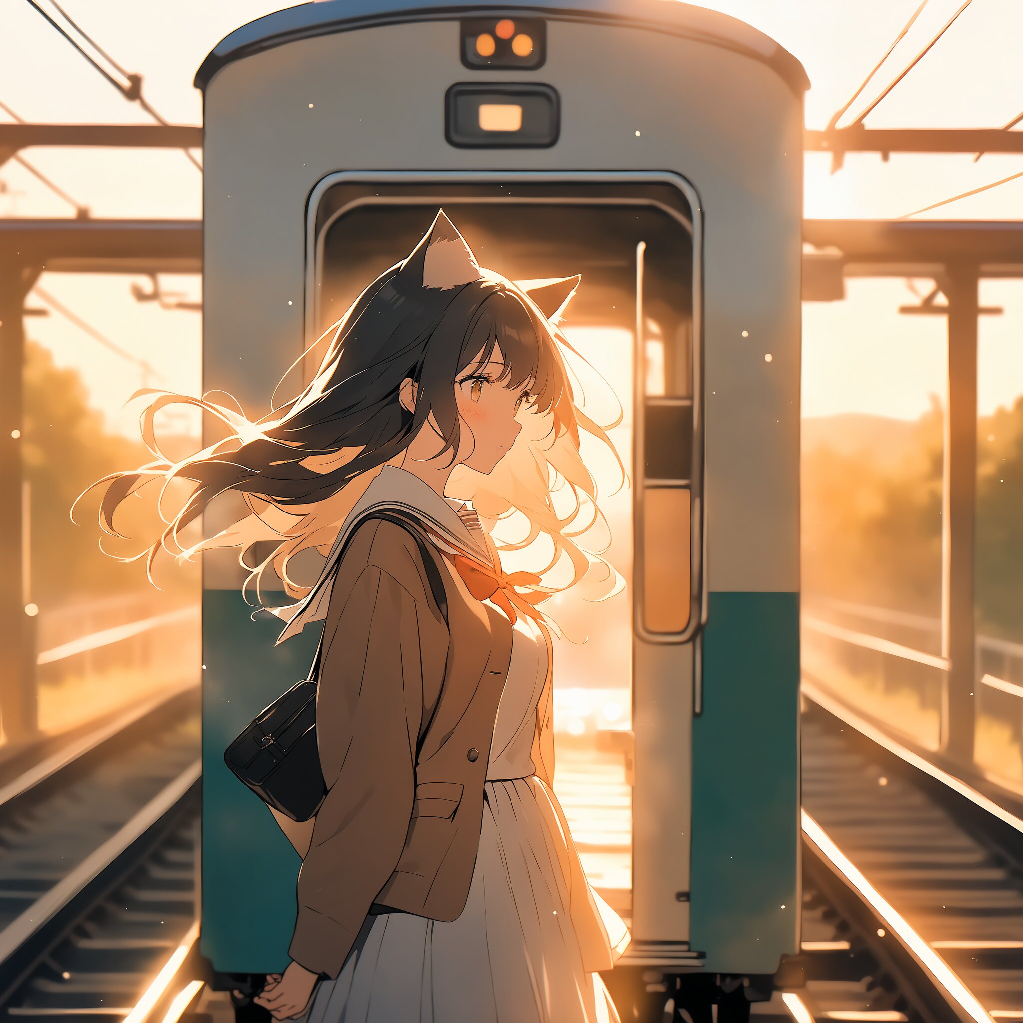 Cinematic and nostalgic, a cat-eared girl in a school uniform standing on a rural train station platform at sunset, golden hour sunlight illuminating the edges of her hair and cat ears, wind blowing her skirt and hair gently, she is looking into the distance with a melancholic and longing expression, dust motes dancing in the light, film grain texture, soft bokeh background, masterpiece, 8k, emotional atmosphere.