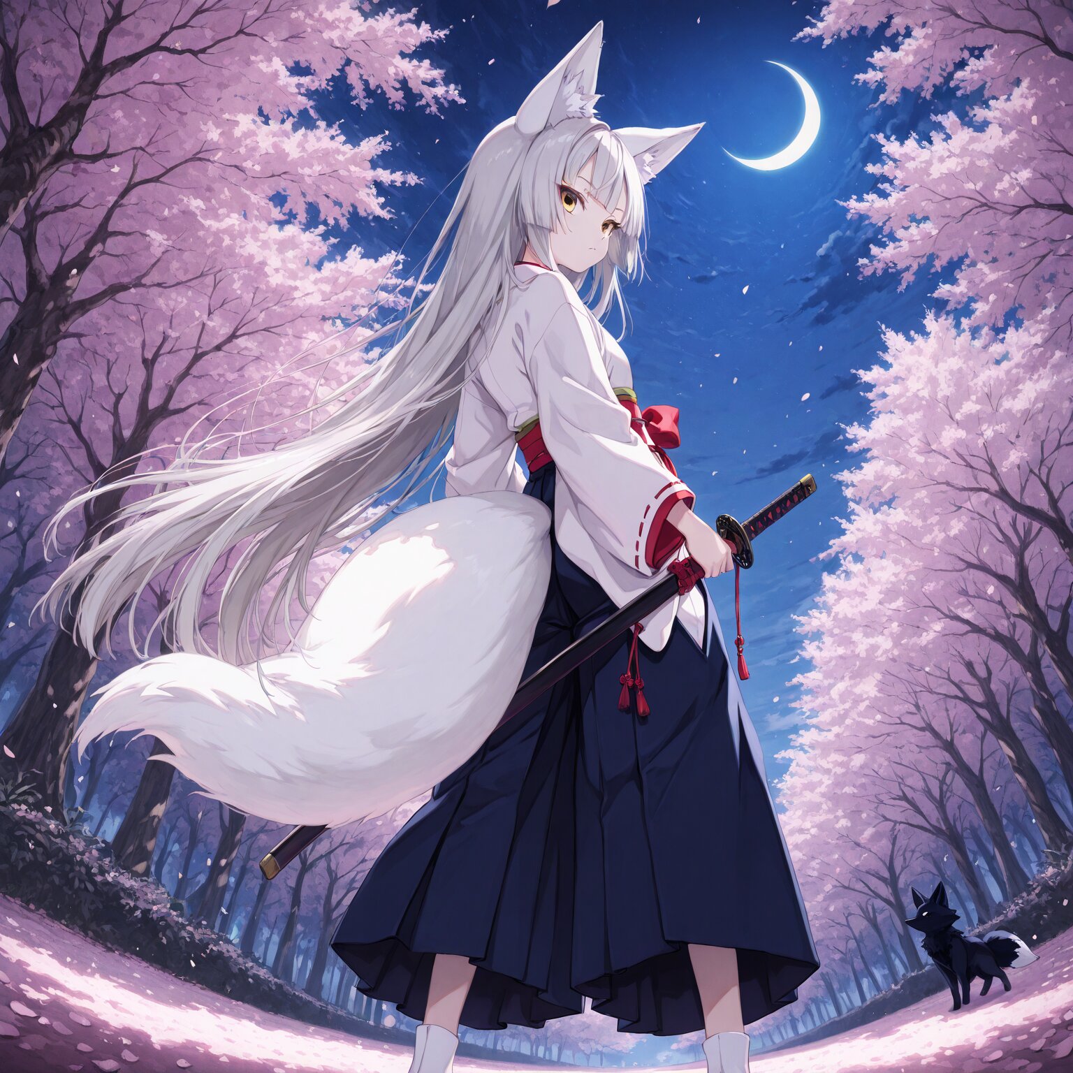 (1girl) BREAK, ((short height:)), ((silver hair:1.3 )), ((very long hair: 1.3)), straight hair, tidy hair, golden eyes, ((golden eyes:1.3)), fangs , small breasts, slender, white skin, princess cut, hime cut, expressionless, ((aligned bangs)), ((aligned hair)), ((aligned side hair)), BREAK ,(small:1.3), girl, ((child:1.4)), BREAK , (fox ears, Silver fox ears:1.5), (silver fox tail:1.5),((white ears, white tail:1.6)) Japanese clothing, traditional Japanese attire, haori jacket, hakama trousers, zori sandals, tabi socks Drawing a sword, unsheathed sword, holding a sword Night, crescent moon, darkness, moonlight, cherry blossoms fluttering Standing, ((fighting, action)), Back view, looking back, from below, , perspective, feet out of frame BREAK, (newest, anime, animation, anime screen capture, anime style:1.3) BREAK, (masterpiece, , vibrant, very aesthetic, highly detailed, best quality, 16k:1.3)