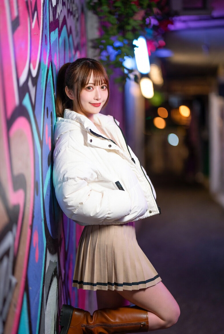 Portrait of a cute 日本人女性25歳 with long brown hair tied in a ponytail, straight bangs framing her face, soft smile, looking directly at the camera. She’s wearing a white puffer jacket with black zippers, paired with a beige pleated mini skirt with dark trim, and brown knee-high boots with zippers. Posed leaning casually against a vibrant graffiti wall in a neon-lit indoor hallway with pink, blue, and purple lighting, bokeh background with hanging plants and blurred lights, high detail, realistic photography style, sharp focus on face and outfit, cinematic atmosphere.