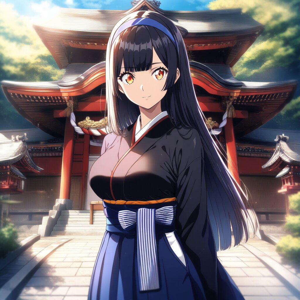 ((masterpiece)), ((best quality)), (ultra-detailed),anime style,cowboy shot,shrine, a cute girl, 1girl, large bust, Black meiji schoolgirl uniform, beautiful black hair, beautiful orange eyes, ((beautiful eyes)),straight hair, (blunt hair), ((blue hairband))