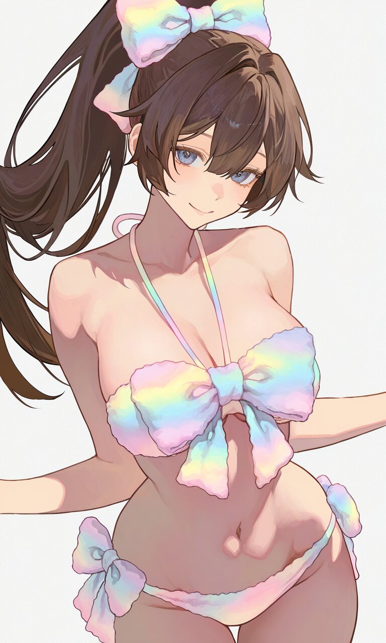 (best quality),(masterpiece),(ultra detailed),1 lady, long ponytail, brown hair, smile (big breasts), ,fluffy pastel rainbow gradient ribbon set, big bow on chest, strapless halterneck bra, side-tie bikini bottom with big bows, iridescent fluffy fabric