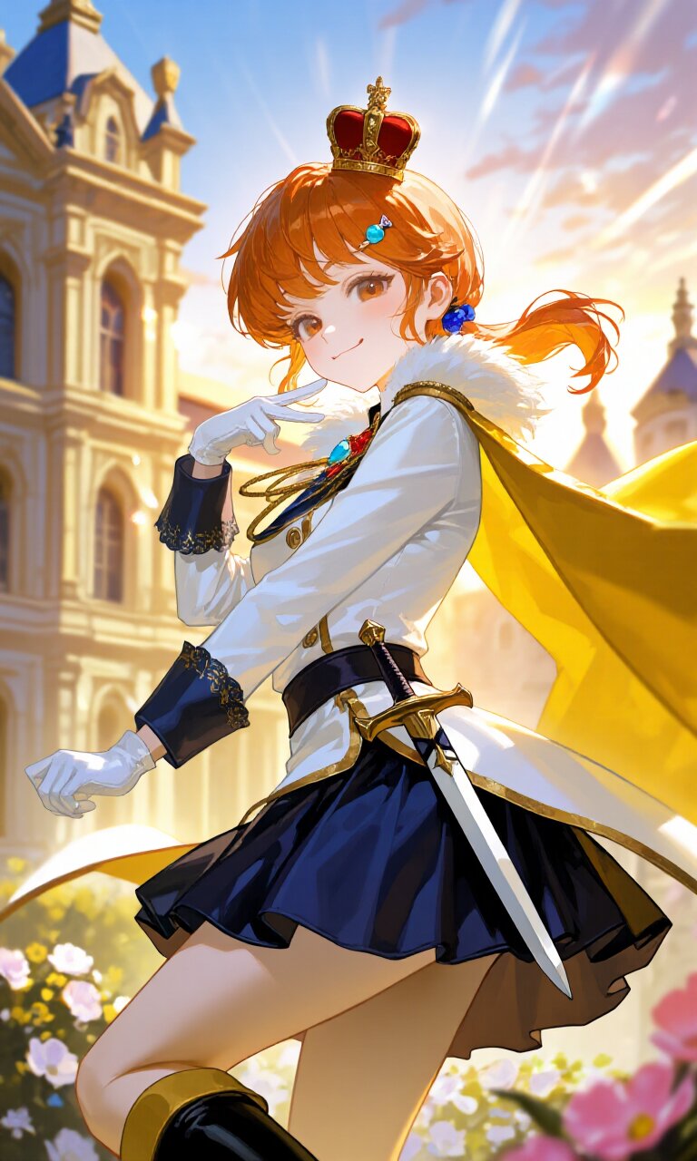 a 16-year-old girl with strawberry blonde hair styled in a low side ponytail and adorned with a candy hairpin, gazes playfully at the viewer with caramel brown eyes. Her delicate face features a cheerful smirk, radiating youthful energy. She wears a (White luxurious Prince costume:1.6) with long sleeves, paired with a (luxurious navy mini skirt:1.4) and (luxurious Black Boots:1.3). A (luxurious Yellow Cape:1.3) flows dramatically behind her, while (luxurious White gloves:1.3) cover her hands. A (dagger on waist:1.3) and (luxurious crown on head:1.4) complete her princely ensemble. She stands outside a grand palace with retro architecture, surrounded by blooming flowers during golden hour sunset. Sunbeams filter through the romantic academia setting, casting warm light on her detailed skin, delicate hair strands, and intricate costume fabrics. The image captures her in a cute pose, embodying both fairy magic and princely charm with insanely detailed, 16k quality rendering.