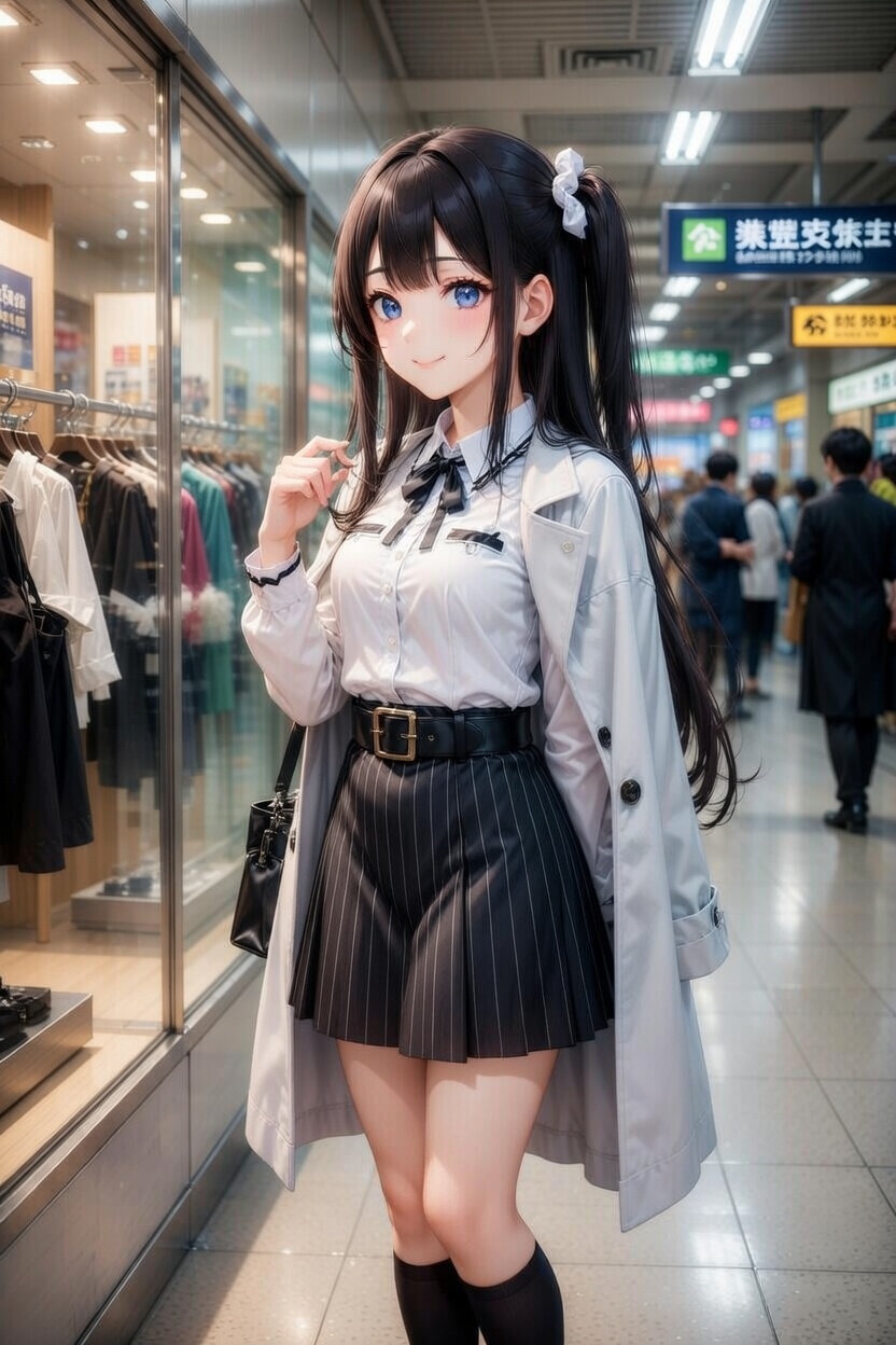 日本人女性のイラスト。黒のアクセントカラーをもつフェミニンな印象を与える白のブラウスと、白黒ストライブのミニ丈のフレアスカートと、黒い太いベルトと、黒のハイソックスを身につけている。ライトグレーのハーフコートを羽織っている。駅ビルの中でウインドウショッピングを楽しんでいる。表情はおすまし。