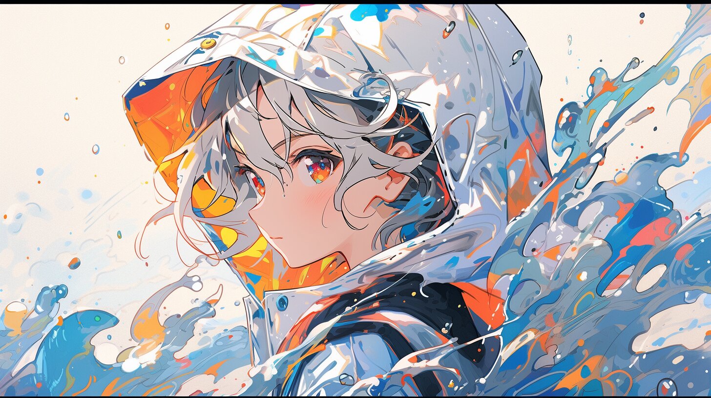 銀色の髪を雨に濡らした少女は、波のように広がる水しぶきの中で静かに佇む。彼女は雨の精霊として、この街を守る使命を負っていた。ある日、失われた記憶の欠片が雨粒とともに蘇る。フードの下の赤い瞳が、遠い過去の冒険を語るように輝く。彼女の周りで渦巻く水は、未知の物語を呼び起こすのか? 雨の音が、彼女の心に新たな旅を囁く。