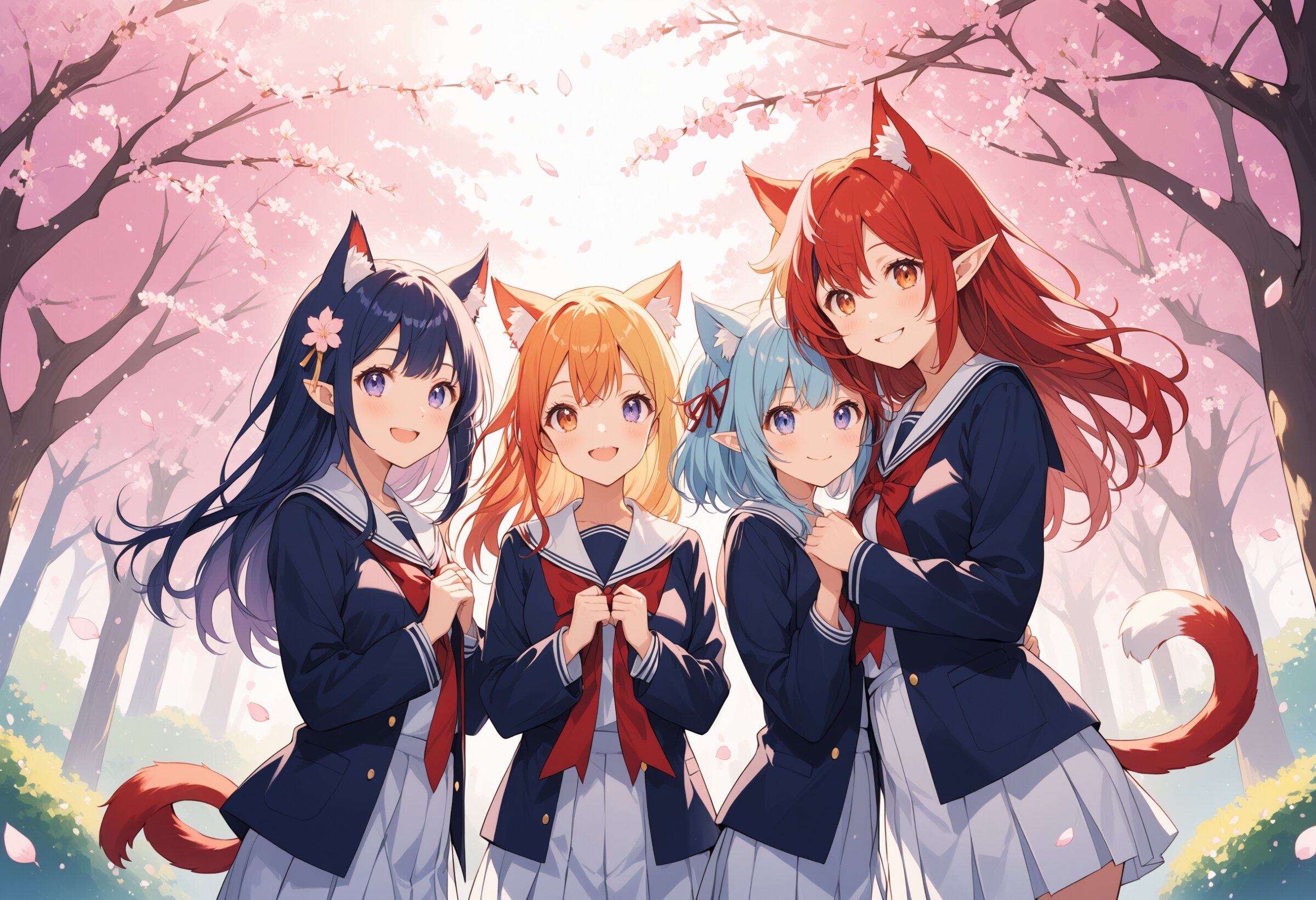(Best quality), (Masterpieces), (ultra-detailed), (highres), illustration style, anime style, beautiful detailed background, vibrant colors, soft lighting, depth of field, cinematic composition, 8k, 3girls, group photo, standing side by side, smiling, happy, girl1 (oni girl): oni horns, red horns, japanese school uniform, strong and cheerful expression, wild hair, girl2 (cat girl): cat ears, cat tail, school uniform, cute expression, fluffy ears, striped tail, girl3 (elf girl): elf ears, pointy ears, school uniform, elegant, long hair, gentle smile, all holding graduation diplomas, graduation ceremony, cherry blossom tree, falling sakura petals, spring, soft warm sunlight, bokeh background, school graduation day, commemorative photo pose.