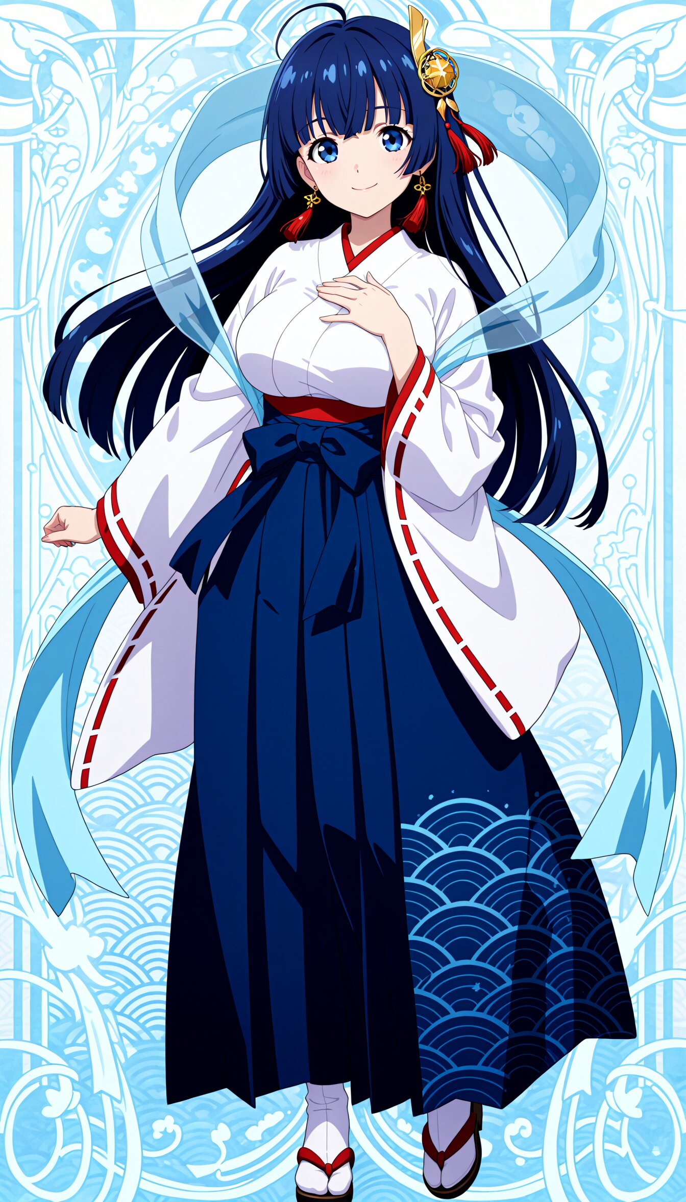 <lora:MeMax6-noob-vpred:1>,memaxl6_a,memaxl6_b,memaxl6_c,memaxl6_d,memaxl6_e, Full HD,32K, 1girl, (((((solo))))), full body, standing, (smile), ((looking at viewer)), closed mouth, hand on own chest, (teenage :1.3), (large breast), (slender):1.2, (tareme):1.2, beautiful hair, shiny hair, (dark-navy blue hair):1.2, crossed bangs, (hime cut, long hair):1.1, ahoge, dark-blue eyes, (Celestial Maiden:1.2, japanese clothes, hair ornament, red-white miko, long sleeves, lon g hakama, long blue-hakama, tassel earrings), (light-blue hagoromo:1.6), (Japanese-style patterns background, abstract background, seigaiha pattern, wave patterned background, gradient background, blue background, white background), masterpiece, best quality, super fine illustration, very aesthetic, newest, hyper detailed, intricate, beautiful, aesthetic, highly decorative, HDR, yume kawaii, ,anime screencap,anime,no gradients, 2D flat design, bold outlines, 10's anime style,