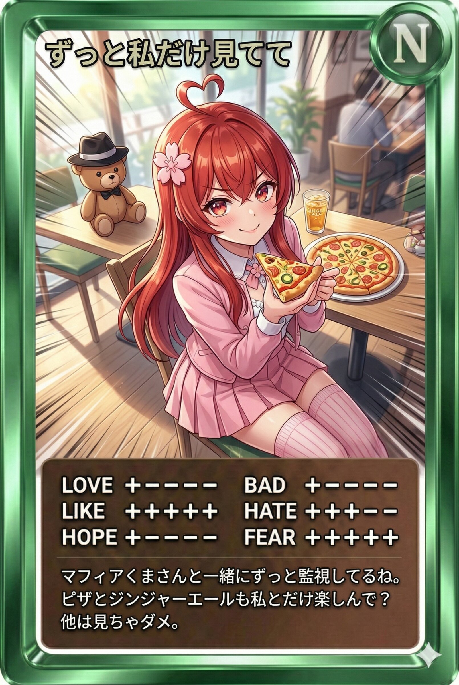 マフィアくまさんと一緒にずっと監視してるね。ピザとジンジャーエールも私とだけ楽しんで?他は見ちゃダメ。