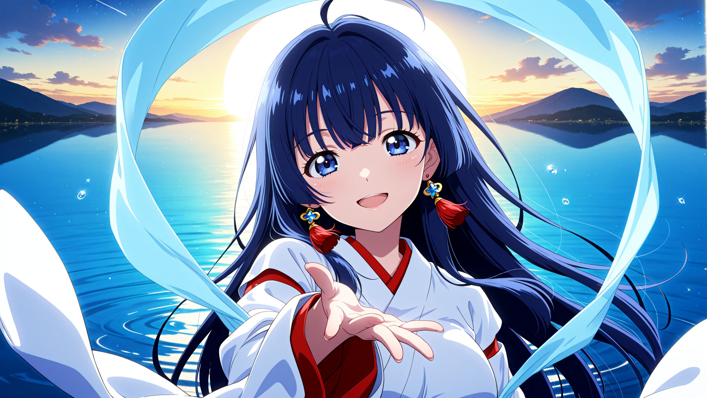<lora:MeMax6-noob-vpred:1>,memaxl6_a,memaxl6_b,memaxl6_c,memaxl6_d,memaxl6_e, Full HD,32K, 1girl, solo, straight-on, portrait, (smile, happy), ((looking at viewer)), open mouth, hand on own chest:1.2, reaching at viewer, head tilt, (teenage :1.3), (large breast), (slender):1.2, (tareme):1.2, beautiful hair, shiny hair, (dark-navy blue hair):1.2, crossed bangs, (hime cut, long hair):1.1, ahoge, dark-blue eyes, (Celestial Maiden:2.0), (japanese clothes, red-white miko, long sleeves, tassel earrings), (light-blue hagoromo:1.3), (wind, morning, sunrise, water, ripples, water drop, ):1.2, (natural lighting:1.4, high contrast:1.3, backlighting:1.4), masterpiece, best quality, super fine illustration, very aesthetic, newest, hyper detailed, intricate, beautiful, aesthetic, highly decorative, HDR, yume kawaii, ,anime screencap,anime,no gradients, 2D flat design, bold outlines, 10's anime style,