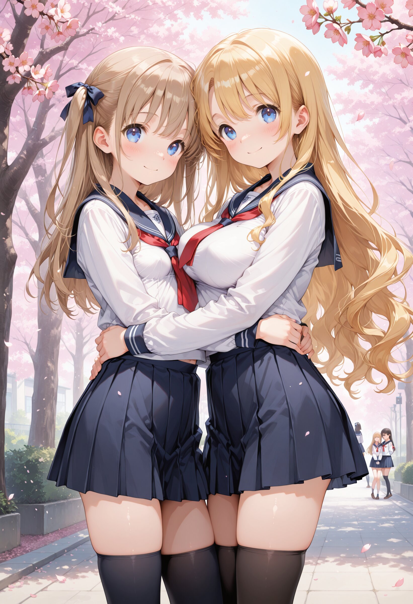 masterpiece, best quality, amazing quality, general, fine detail, official art, 2girls, loli, petite, high-school student, blonde wavy long hair, blue eyes, , (sailor collar), (white shirt), (red tie), (miniskirt), big breasts, impossible clothes, (perky breasts:1.2),Cherry blossoms, innocent expression, cowboy shot, , slim hip, black thighhighs, Graduation ceremony, graduation season, hug, happy,