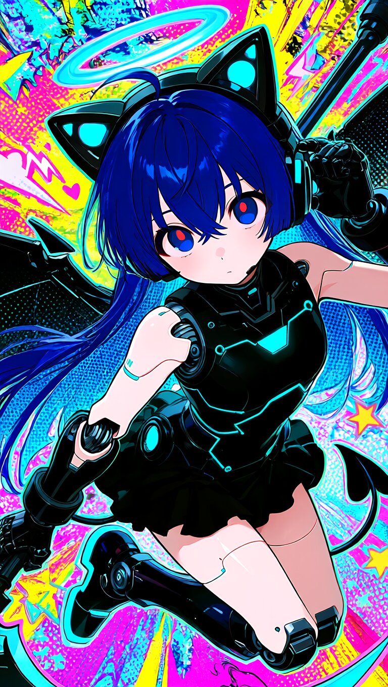 10's anime style, sfw Illustration, Full HD, 32K, 1girl, large breast, full body, jumping, from above, legs up, android:1.2, (glowing light blue lines:1.6, white visible seams:1.6), mechanical joints, (skin, thighs:1.6, upper arms:1.2), mechanical arms, (black mechanical gloves:1.2), black mechanical legs, interface ports, (black mechanical wings:2.0, large mechanical wings:1.6), (black cat ear headphones:1.6), (black mechanical cable tail:1.6, devil tail:1.6), (blue eyes:1.6, simple eyes, red pupils:1.4), (solo), (teenage):1.4, (mechanical clothes, black clothes:1.4, sleeveless, black skirt, ), holding scythe, mechanical scythe:1.8, (teenage :1.3), (tareme:1.2), beautiful hair, shiny hair, straight hair:2.0, (dark blue hair:1.2), crossed bangs, (hime cut, very long hair:1.1), ahoge, ((dark blue eyes)), blue halo, expressionless, closed mouth, looking at viewer:1.2, Psycho, star (symbol), thunder, heart,