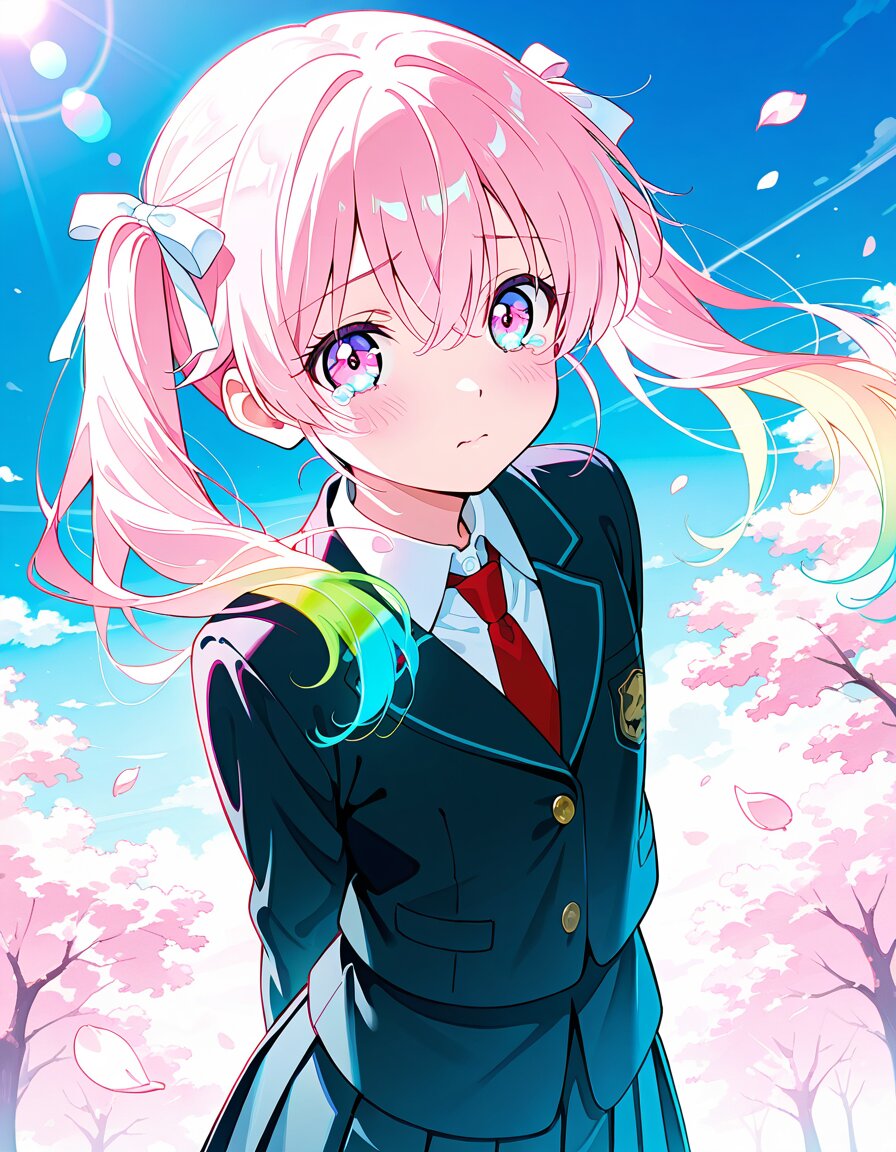 masterpiece, best quality, kawaii petite loli girl, flat chest, long pink twintails with large white ribbons, beautiful detailed face, large expressive teary eyes, glistening tears rolling down cheeks, sad lonely melancholic expression, looking slightly down, wearing black blazer school uniform, white collared shirt, red ribbon tie, pleated skirt, graduation ceremony theme, standing gracefully with cherry blossom petals gently falling and swirling around her, soft pink sakura petals in the air, prismatic light effect only, rainbow light refraction, spectral light dispersion, iridescent color streaks, light splitting into vivid spectrum, translucent glow, light leak effect, soft color bleeding, warm cinematic light leaks, dreamy glow, gentle overexposure, pastel tones, strong lens flare, cinematic sun flare, anamorphic light streaks, soft bloom, volumetric lighting, sparkling highlights on tears and cherry blossom petals, beautiful rim lighting, pastel anime style, soft semi-realistic anime style, delicate semi-realistic details, subtle realistic textures, ethereal pastel colors, soft painterly shading, transparent atmosphere, delicate details, emotional bittersweet atmosphere