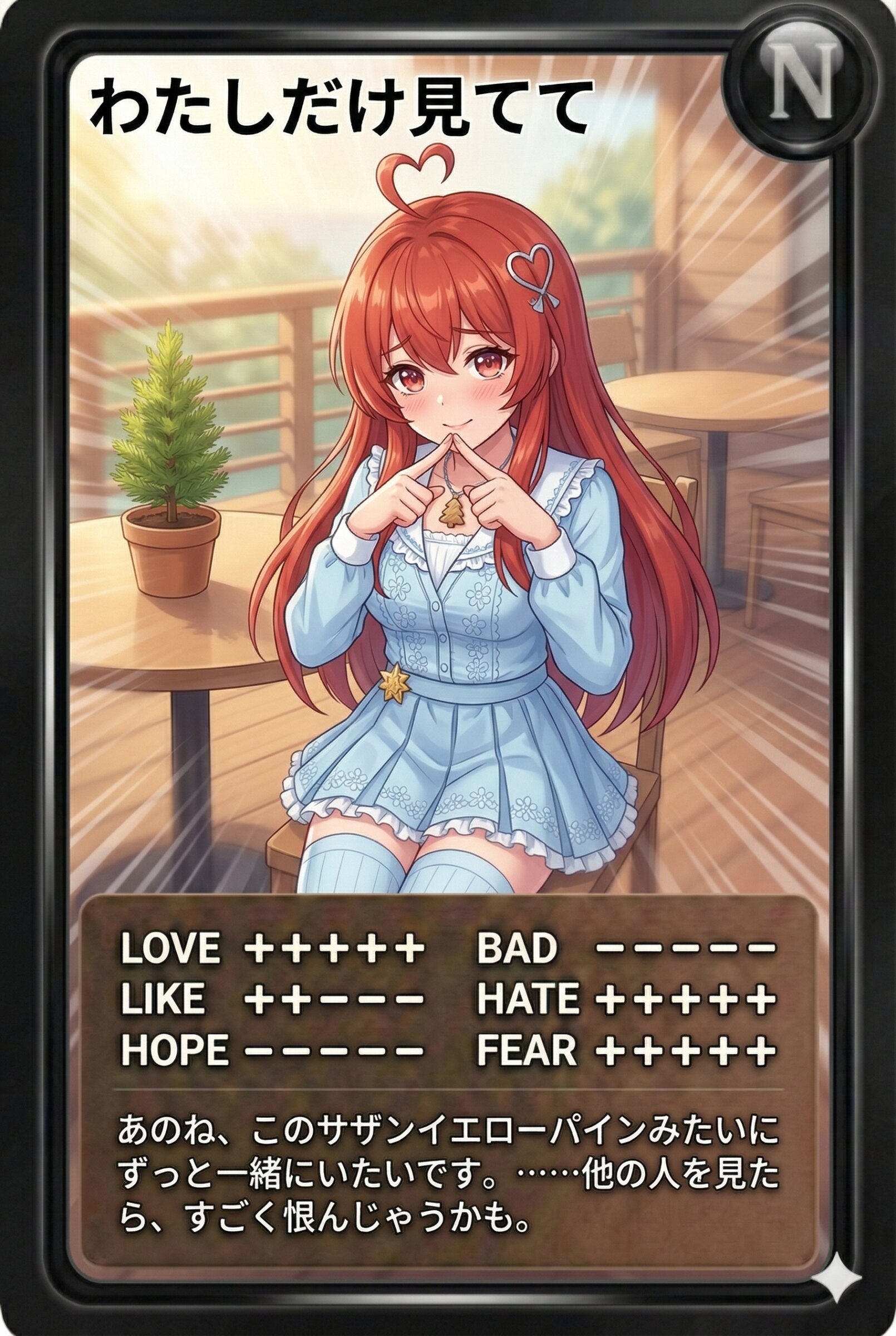 あのね、このサザンイエローパインみたいにずっと一緒にいたいです。……他の人を見たら、すごく恨んじゃうかも。