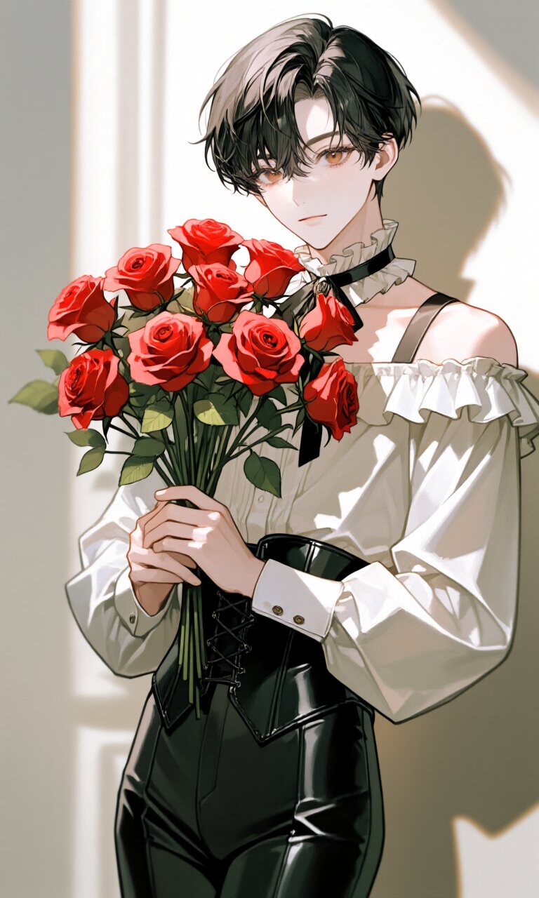 Masterpiece, high quality, fine lines and ink color, A beautiful youth, a 19-year-old Japanese man with an innocent expression, soft black hair revealing his forehead, cascading down the sides, pale, almost luminous skin reacting strongly to light, Warm brown eyes possessing a quiet depth, drawing you in involuntarily, Long lashes casting a faint shadow beneath his eyes, perfectly sculpted features. He wears a delicate frilled off-shoulder shirt and a black leather corset, holding a bouquet of red roses and offering it modestly. Cotton tights hug the flowing curve of his legs, accentuating the alluring line of his thighs. Delicate lighting,you_asagi,suger_tail