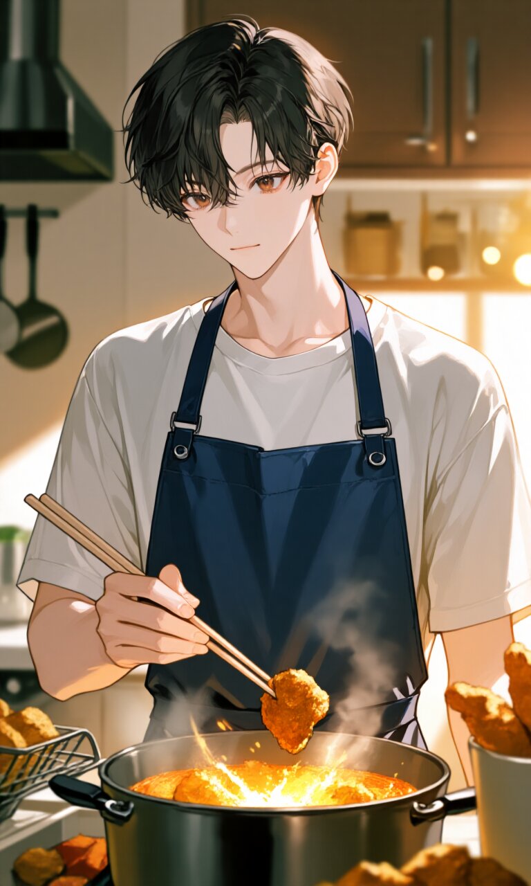 (masterpiece, top quality, best quality, official art, beautiful and detailed:1.2), illustration, 1boy, handsome japanese youth, 19 years old, innocent expression, soft black hair revealing forehead, cascading down the sides, pale luminous skin, warm brown eyes with quiet depth, long lashes casting faint shadow, perfectly sculpted features, (wearing a clean navy blue cotton apron over a simple white t-shirt:1.3), focused on cooking, standing in a cozy home kitchen, (deep-frying karaage:1.4), holding long cooking chopsticks, carefully placing pieces of chicken into a pot of hot, bubbling oil, golden brown fried chicken in the oil, vigorous sizzling and small splatters, steam rising, a wire rack with finished golden-crisp karaage nearby, kitchen counter with ingredients, (dramatic and warm lighting:1.3), intense golden glow from the frying oil illuminating his face and hands from below (underlighting), rim light highlighting his hair and silhouette against the kitchen background, soft depth of field, detailed background bokeh, 4k, 8k, high resolution, ultra-detailed ,you_asagi,suger_tail