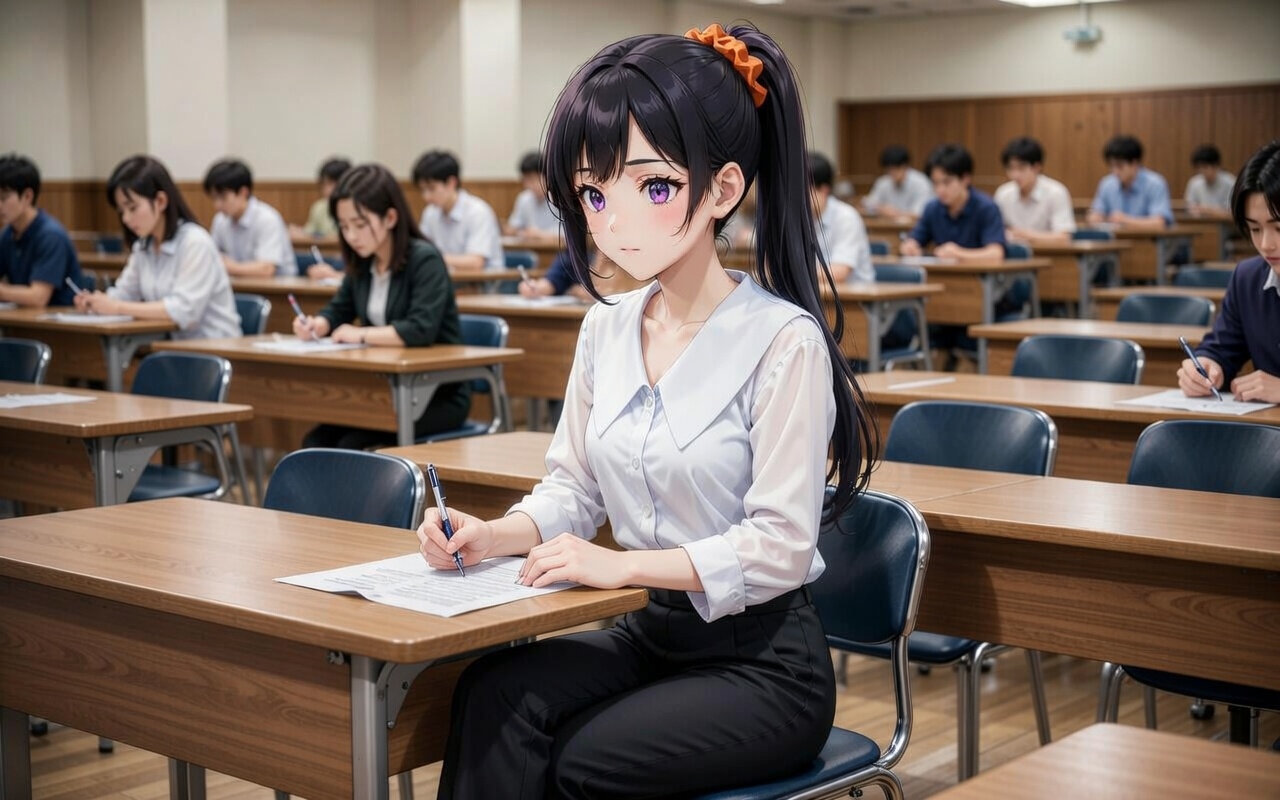 日本人女性24歳のイラスト。襟が大きめの白ブラウスとスラックス。IDカードは外している。机がたくさんある大学の講義室に座って、試験を受けている。