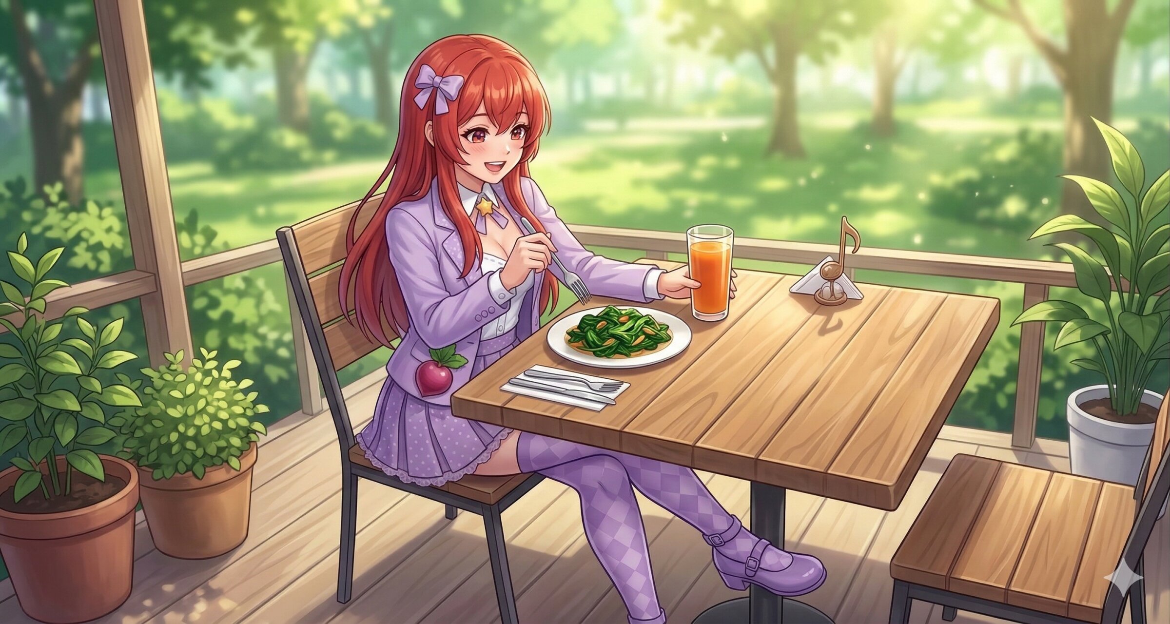 べ、別にあなたのためにほうれん草のソテーや野菜ジュースを用意したわけじゃ…!でも一緒に食べられて幸せです。